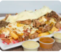 (Porcion personal) Papas a la francesa, salchicha ranchera, pollo y carne en trocitos, tocineta, pepinillo agridulce y salsa ahumada.