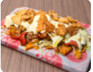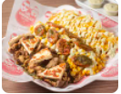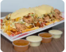 Pechuga en trocitos, queso costeño, papa chongo, lechuga, queso gratinado, salsa Gordales y salsa de piña artesanal.