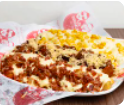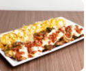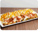 Carne molida en salsa boloñesa, pollo desmechado y queso parmesano.