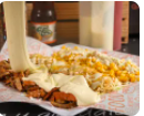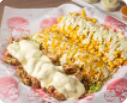 Pollo crispy, queso parmesano, queso costeño, doble queso gratinado, maíz, tocineta, bollo de maíz, papas a la francesa, salsa Gordales, salsa miel mostaza y salsa rosada de la casa.