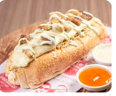 Pan a las finas hierbas, pollo desmechado en salsa blanca, mozzarella, maíz, aros cebolla, jamón, salsa Gordales y salsa rosada de la casa, acompañado con papas a la francesa.