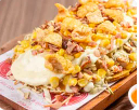 Papas a la francesa con paprika, fundido de queso mozzarella con queso cheddar y tocineta.