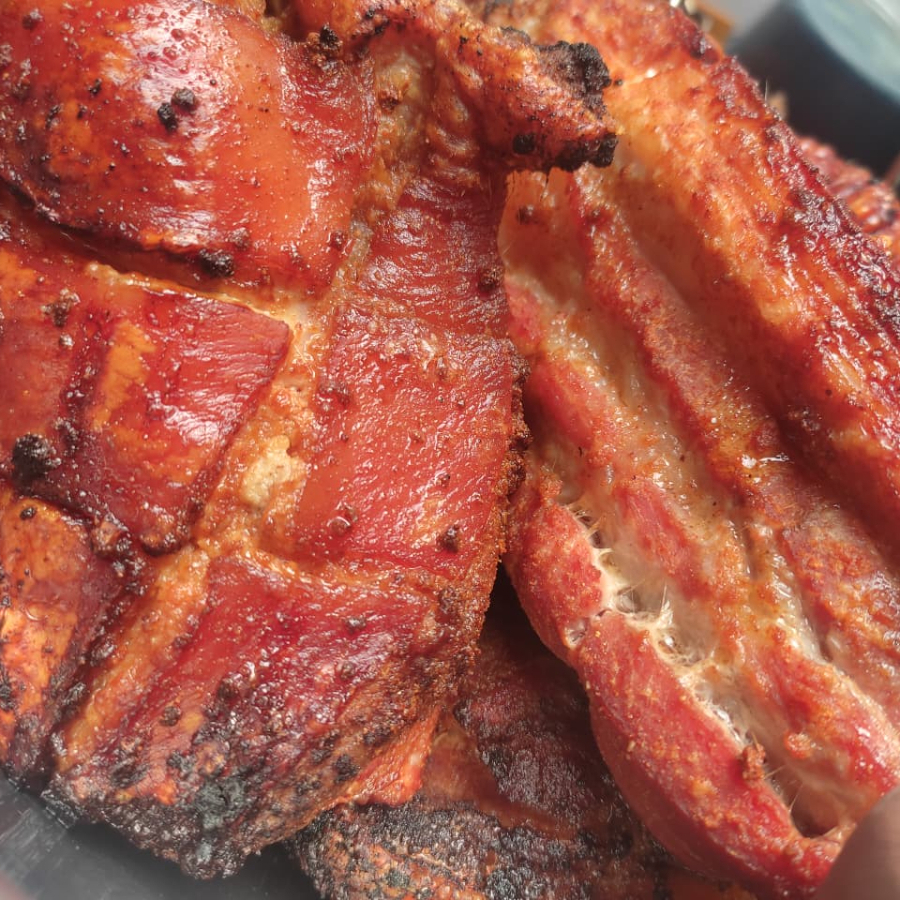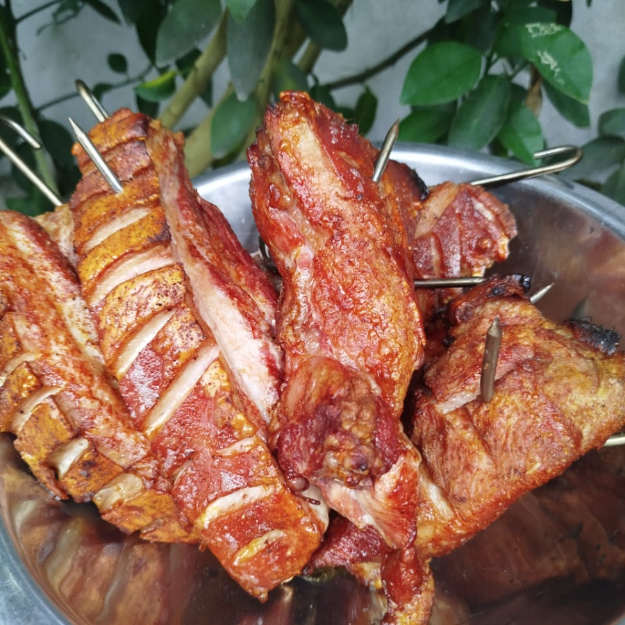 1/2 MEDIA LIBRA DE UN CRUJIENTE Y DORADO CHICHARRON SOZONADO POR LAS BRASAS ACOMPAÑADO DE LIMON, SALSA DE AJO Y SALSA PICANTE