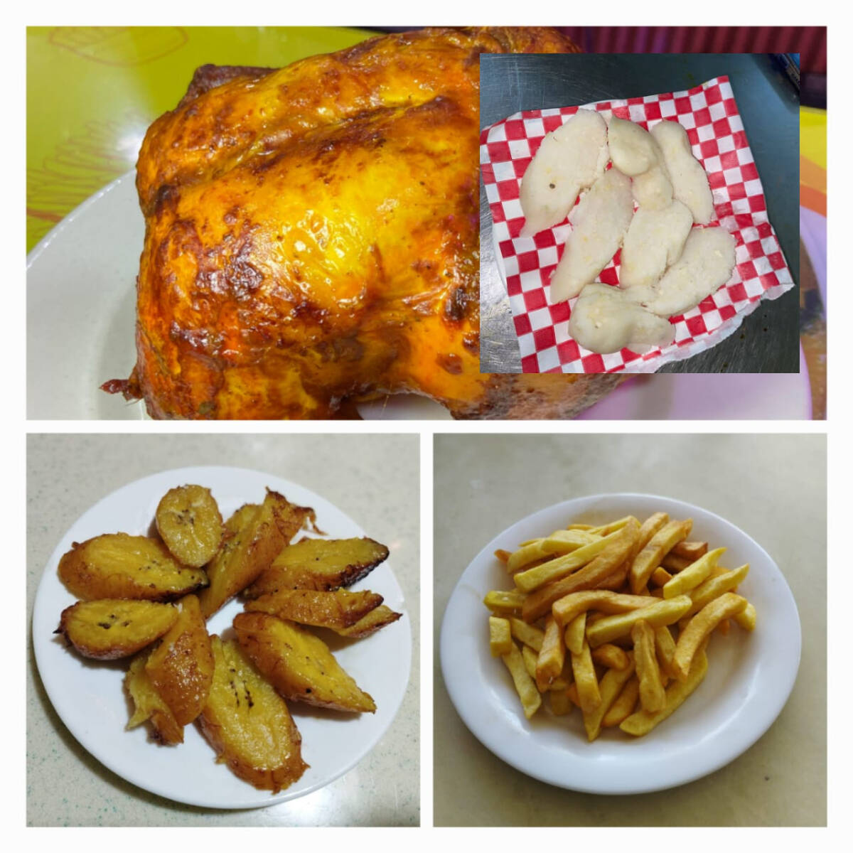 1 pollo, 1 plátano, 4 papas cocidas y salsas
