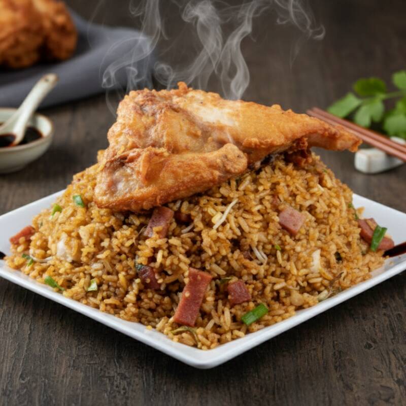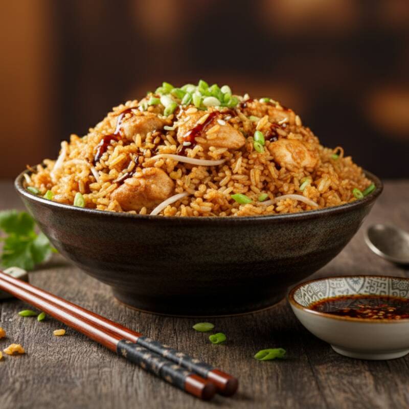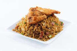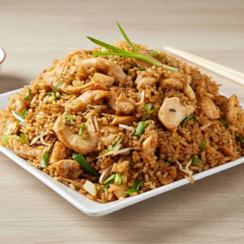 Arroz salteado en wok con trocito de jamón, cebollin y pollo apanado.