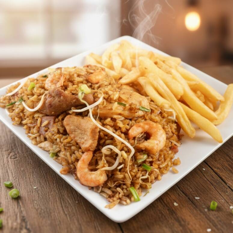 Arroz salteado en wok con trocito de Pollo, camarón, cerdo, jamón, cebollín