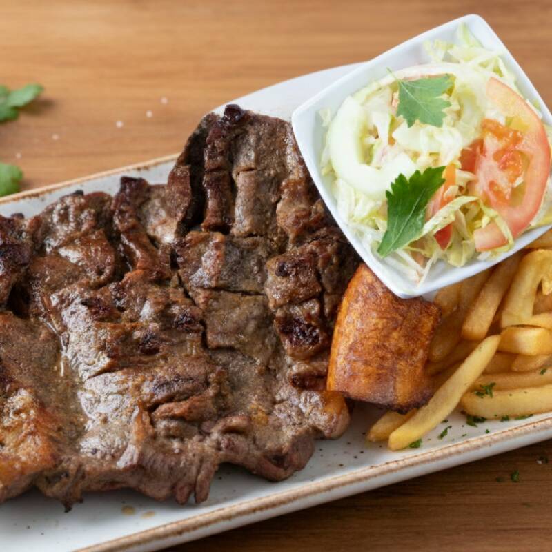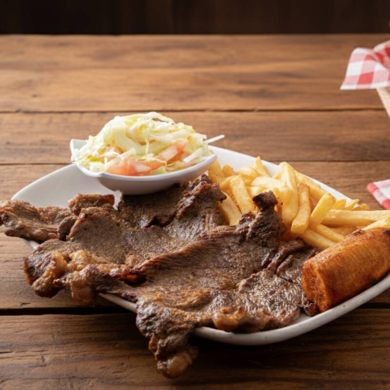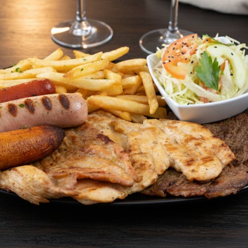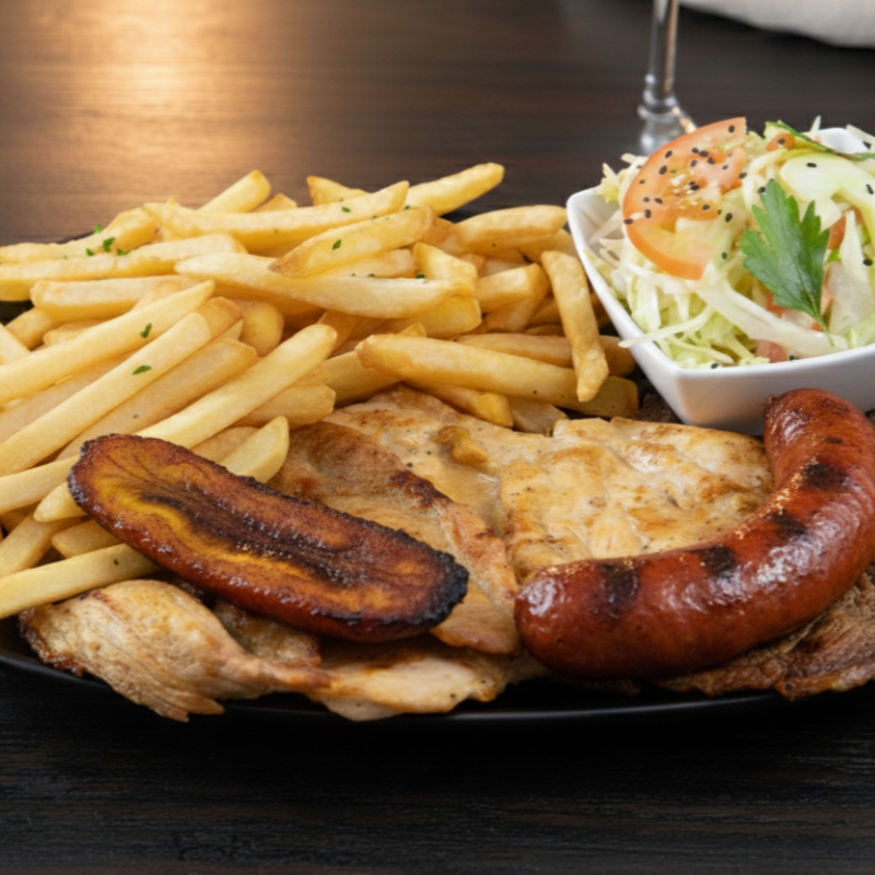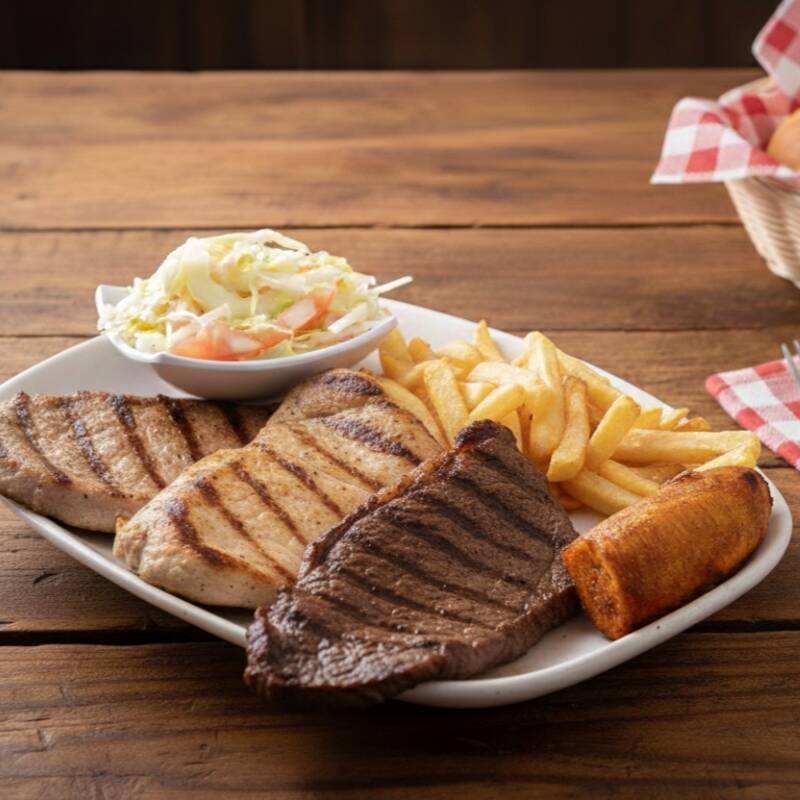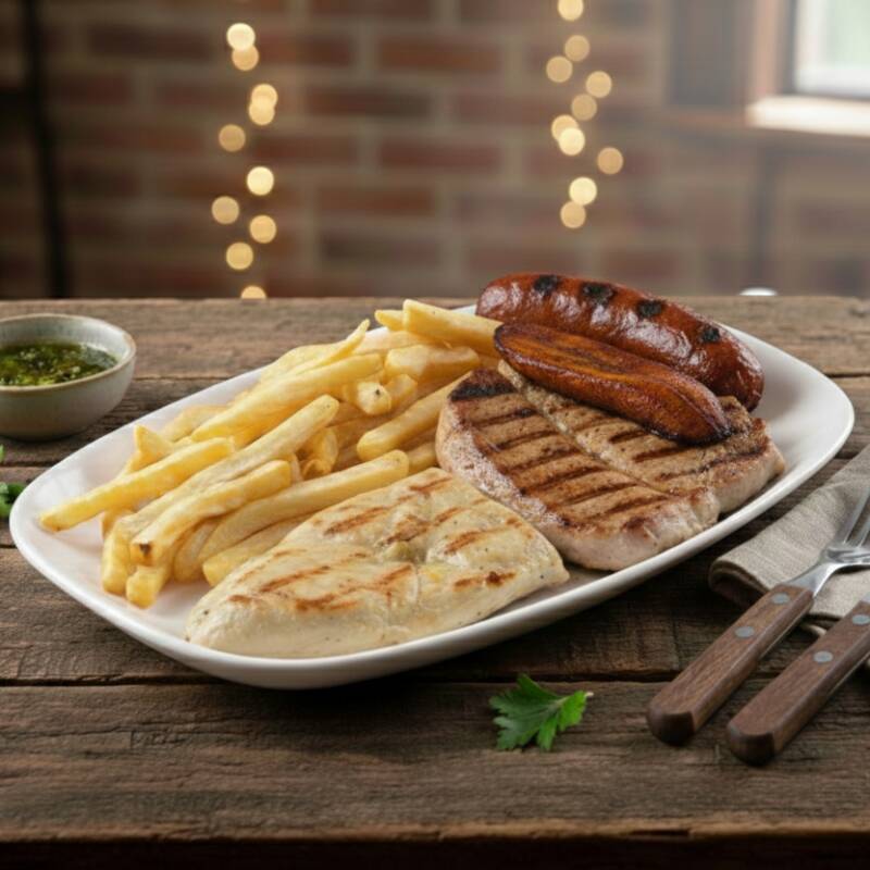filete Pechuga, chorizo, lomo de cerdo, lomo ancho, butifarra, papa frita y plátano maduro.