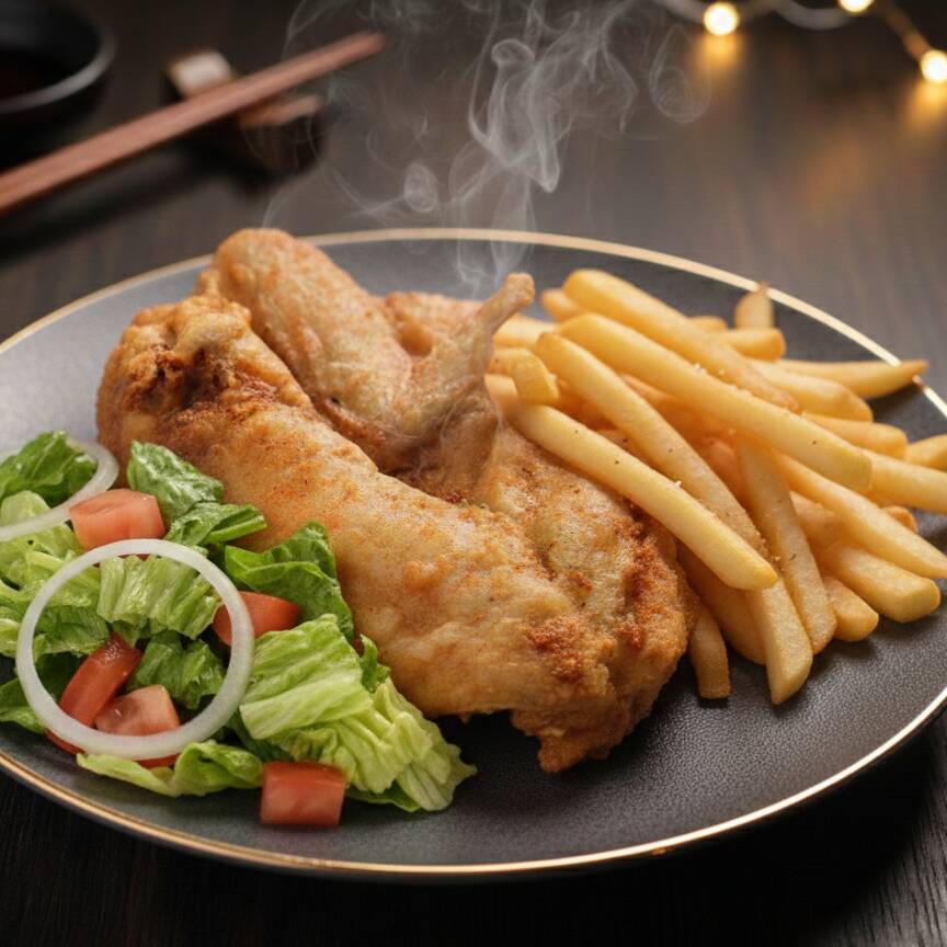 muslo o pechuga, papa a la francesa y ensalada.