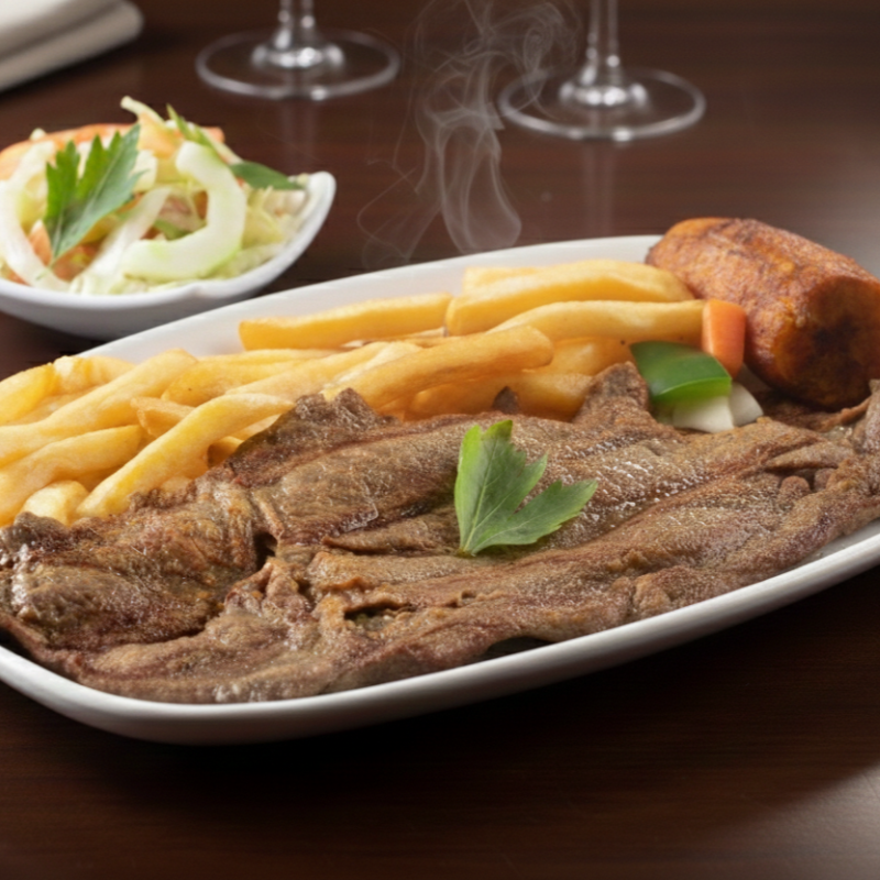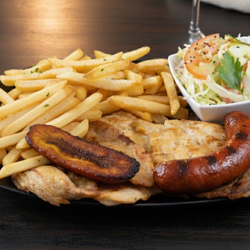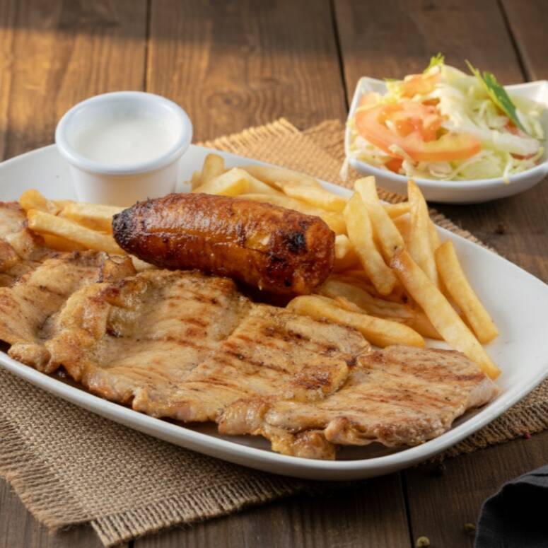 filete pechuga, chorizo, lomo de cerdo, lomo ancho, butifarra, con papa fritas, platano maduro y ensalada