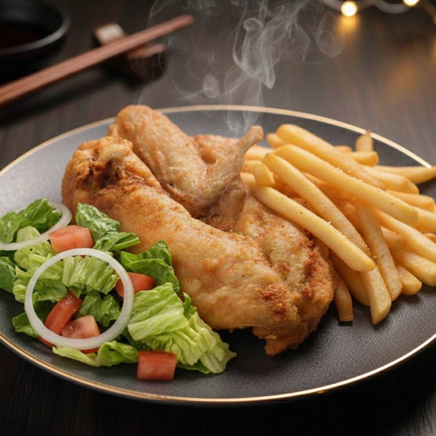 1 muslo y contra muslo, 1 pechuga y ala, con papa fritas, ensalada