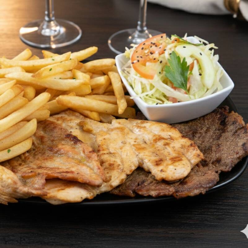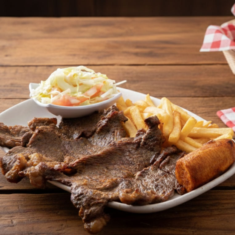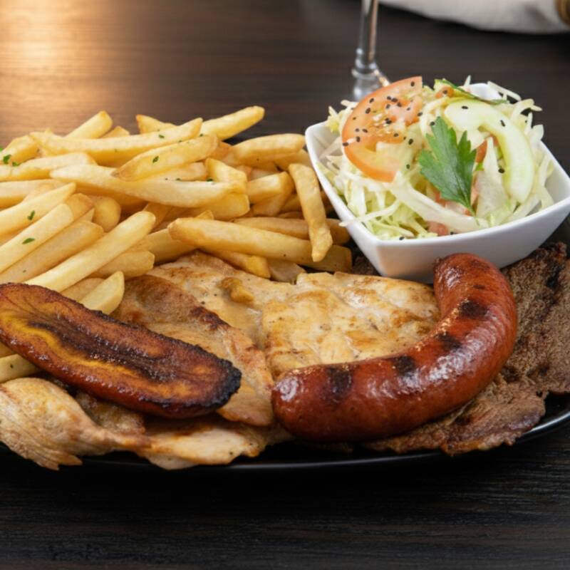 carnes de res, filete pechuga, chorizo, con papa fritas, platano maduro y ensalada