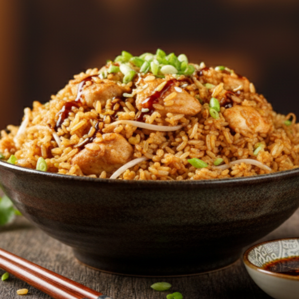 Arroz salteado en wok con trocito de Pollo y cebollín
