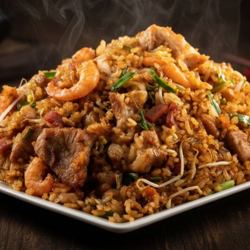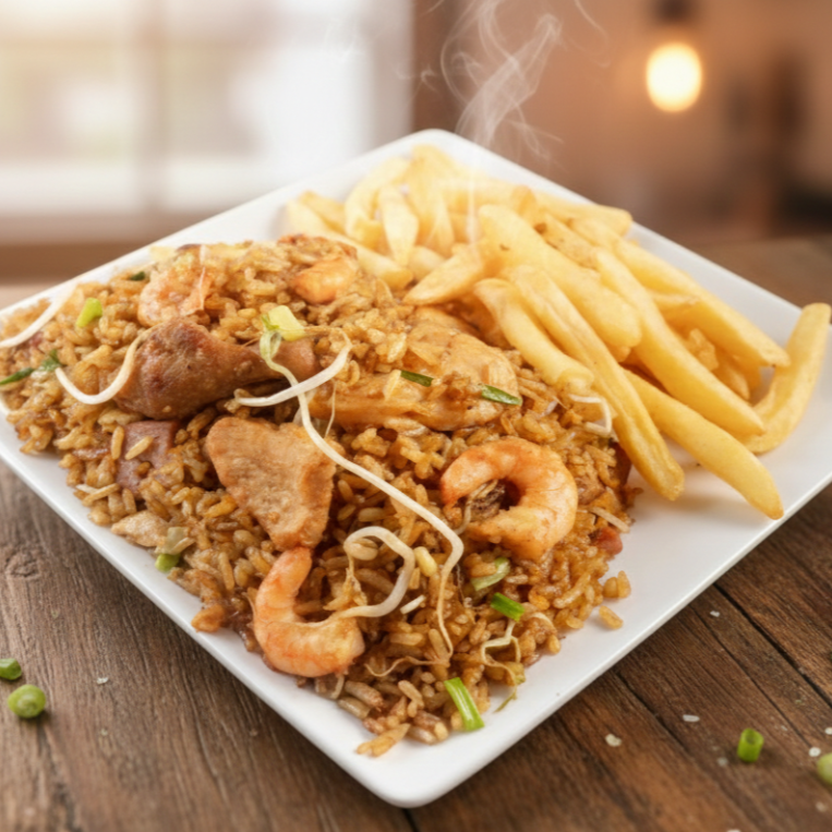 Arroz salteado en wok con trocito de Pollo, camarón, cerdo, jamón y cebollín