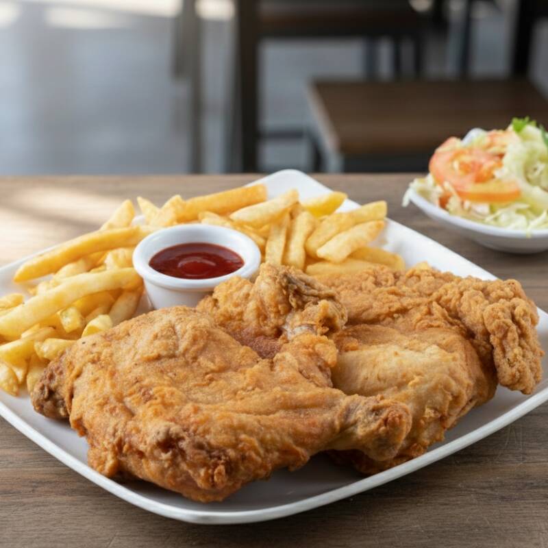 1 muslo, 1 pechuga, papa fritas y ensalada