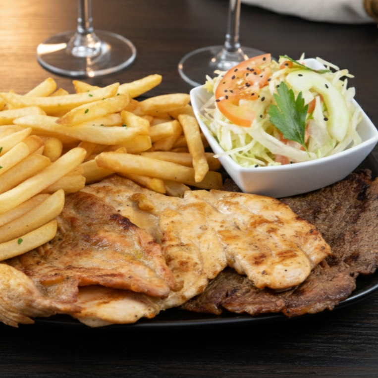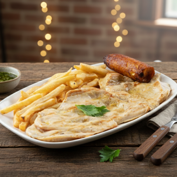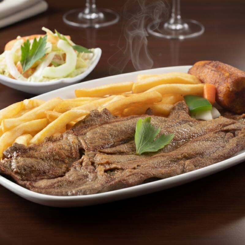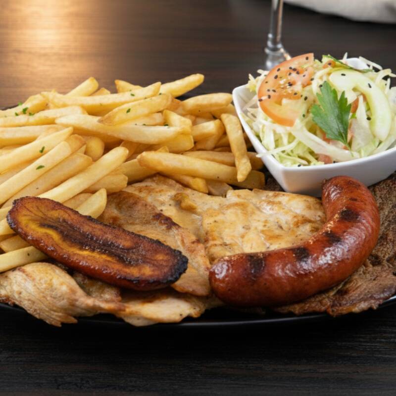 carne de res, filete de pechuga, chorizo, con papa fritas, platano maduro y ensalada