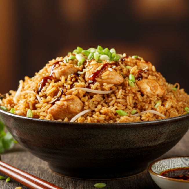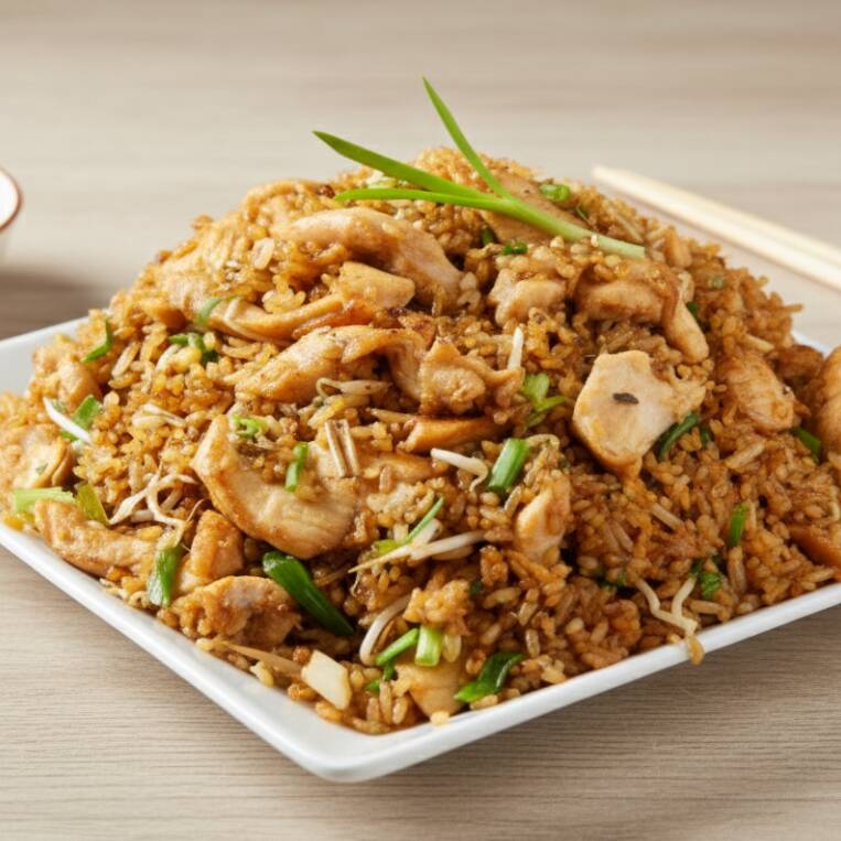 Arroz salteado en wok con trocito de Pollo y cebollín