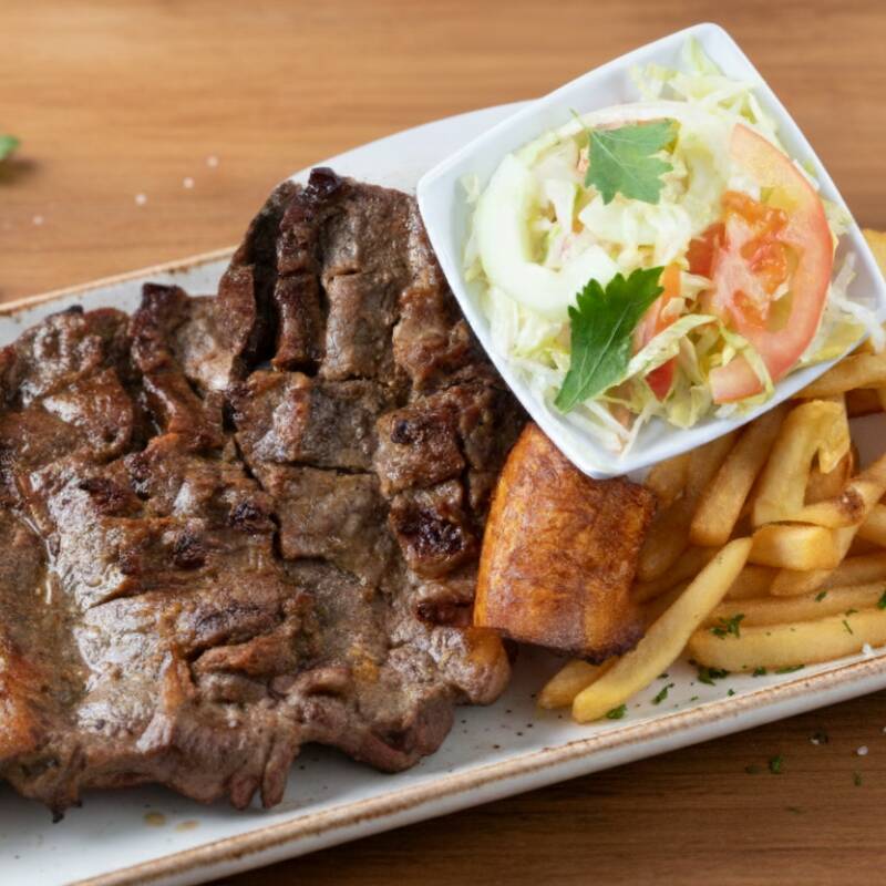 lomo fino de 300 gramos con papa fritas, platano maduro y ensalada