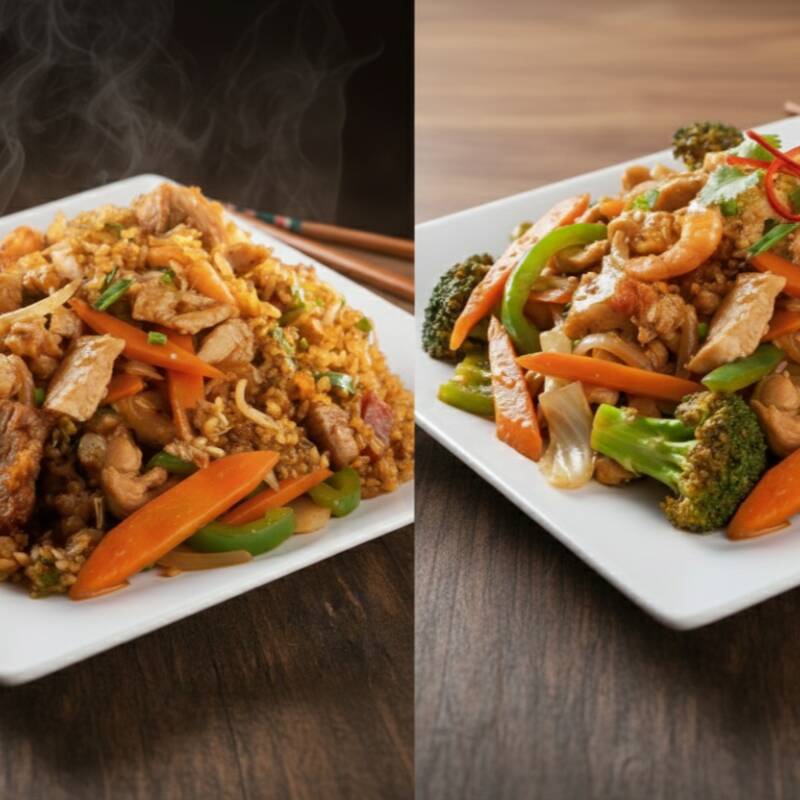 Arroz salteado en wok con trocito de Pollo, cerdo, jamón y cebollín