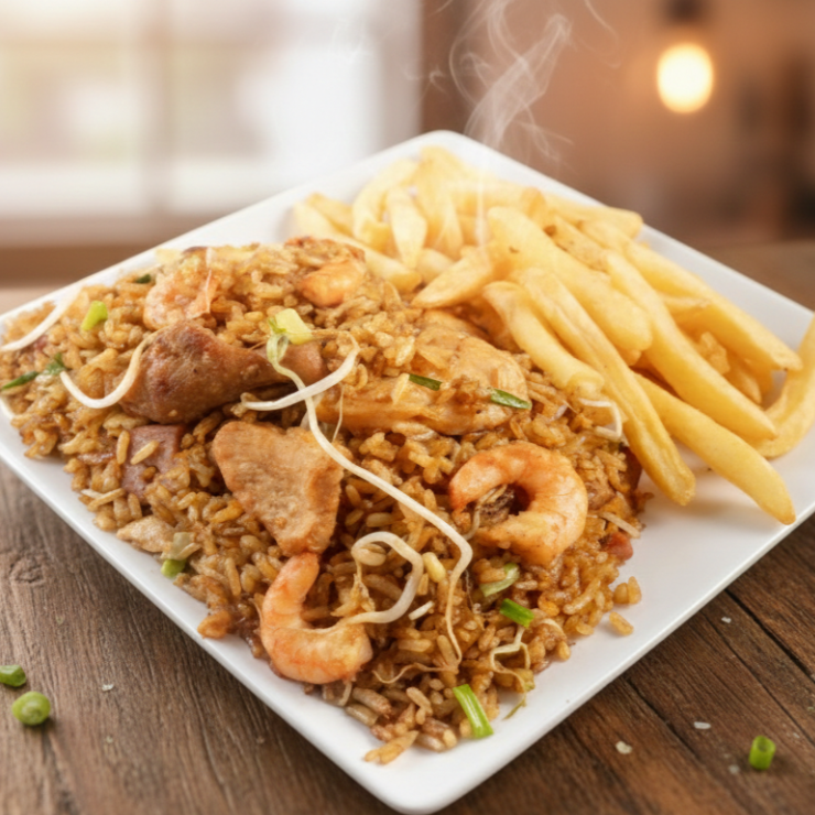 Arroz especial (pollo, jamon, camaron y cerdo), papa a la francesa y gaseosas 250 ml