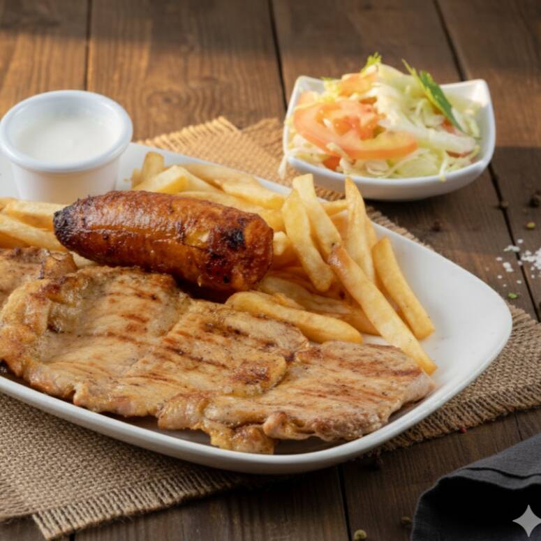 filete de pechuga, lomo de cerdo, chorizo con papa fritas, platano maduro y ensalada