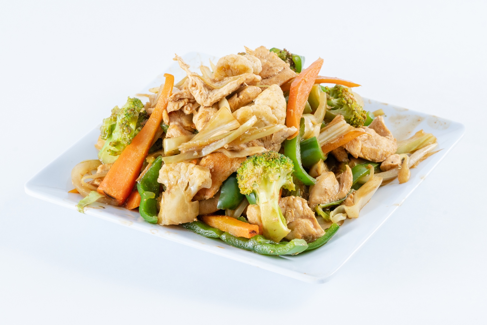 Verdura picado de repollo, zanahoria, apio, pimentón, cebolla, brócoli con pollo