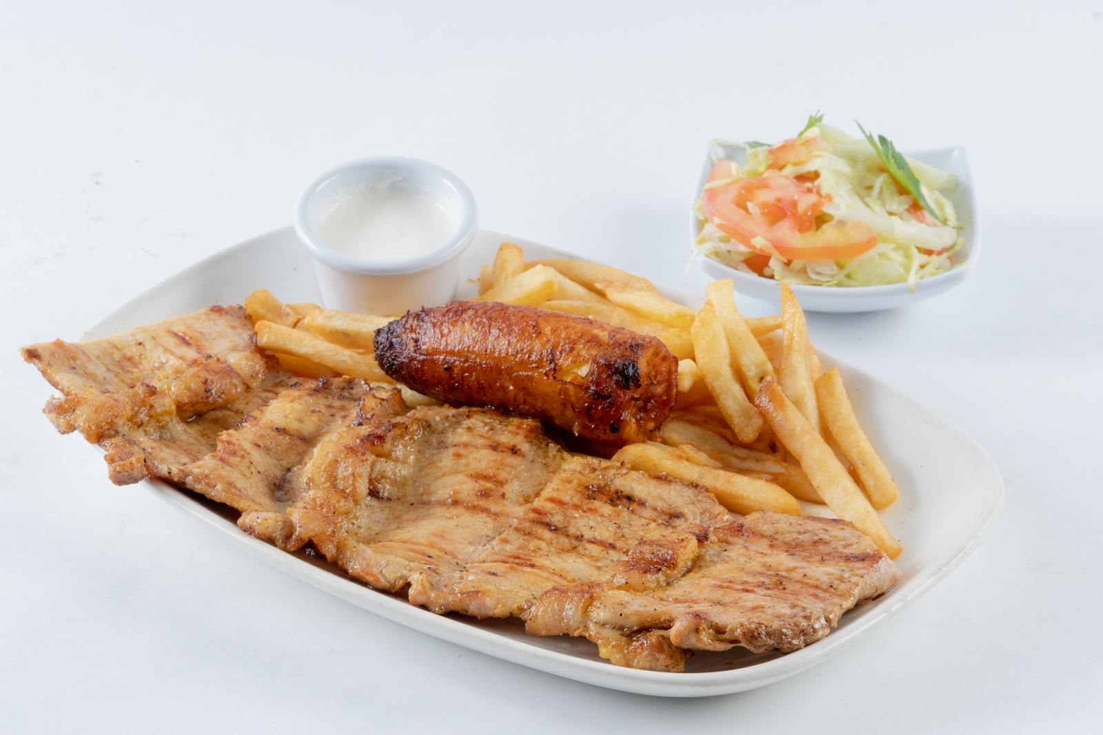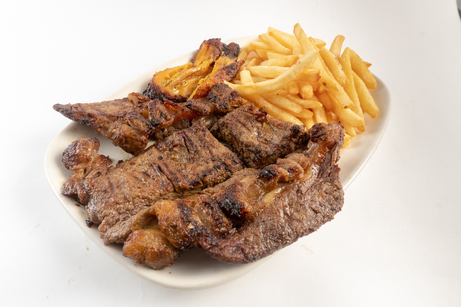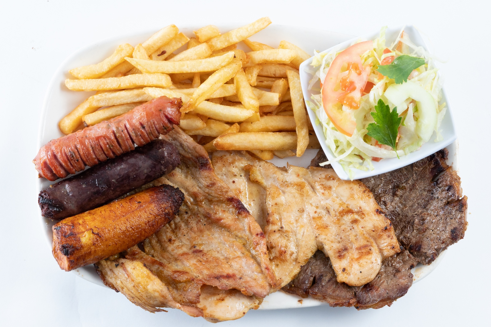 lomo ancho, filete pechuga, chorizo, papa fritas, platano maduro, ensalada