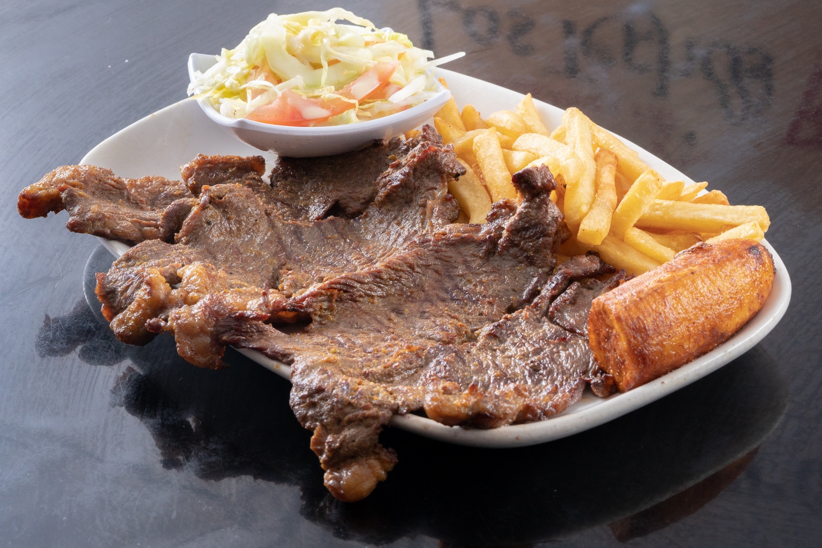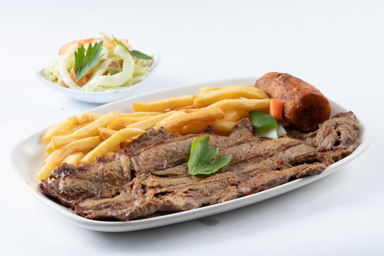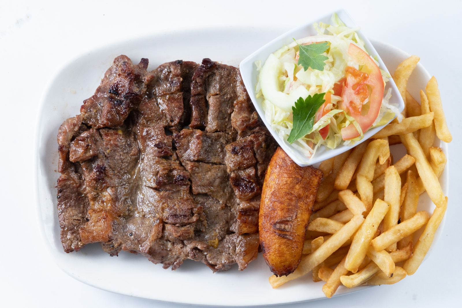 Lomo ancho, filete pechuga, lomo Cerdo, papa fritas, platano maduro, ensalada