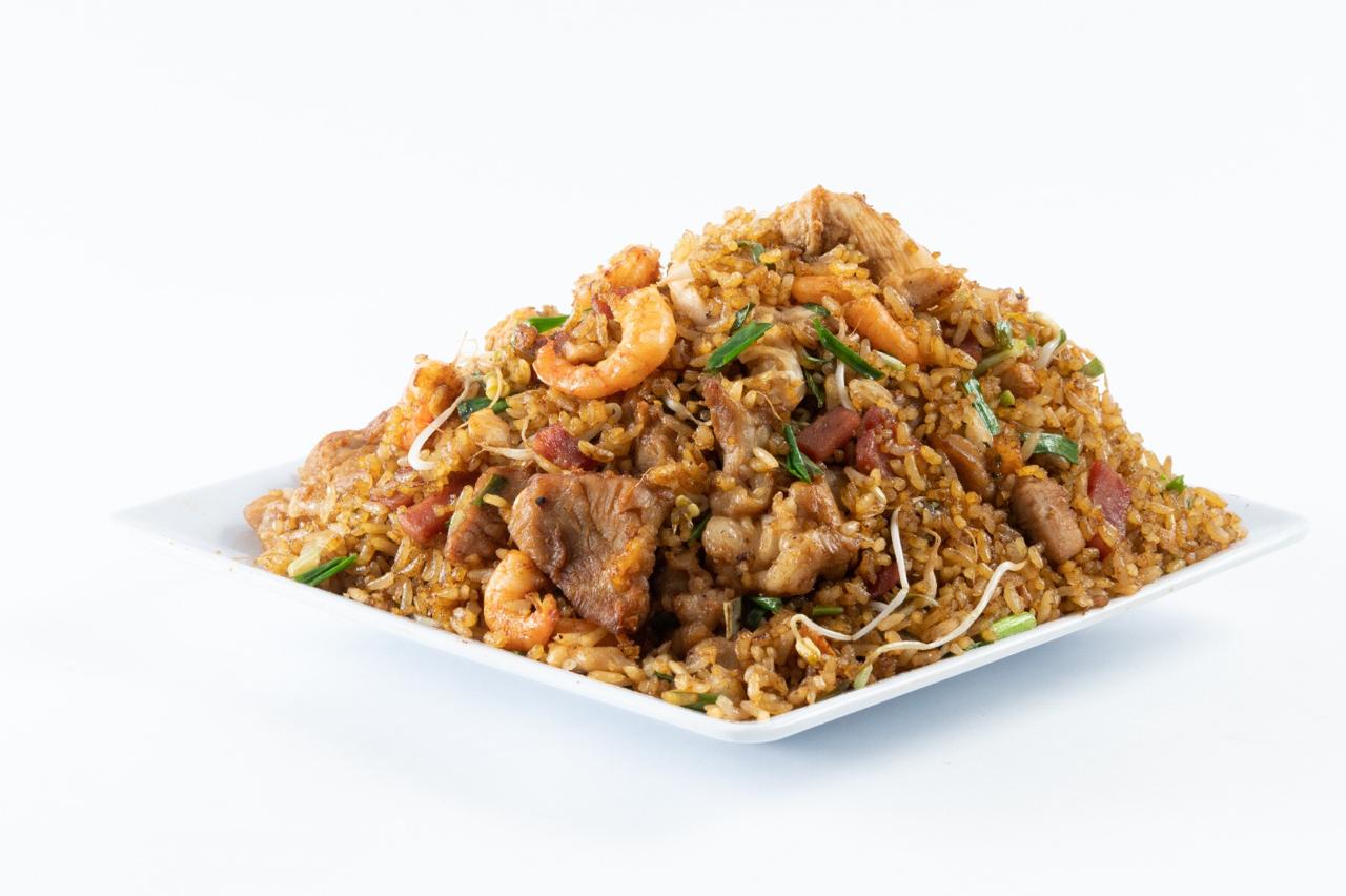 Arroz con Pollo, , cerdo, jamón, cebollín. para 2 a 3 pers.