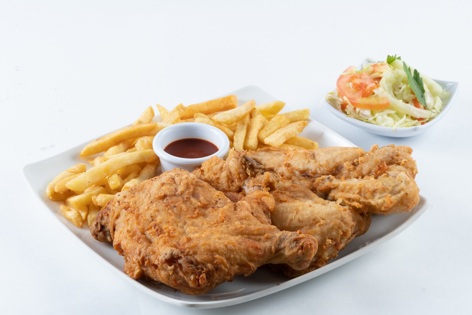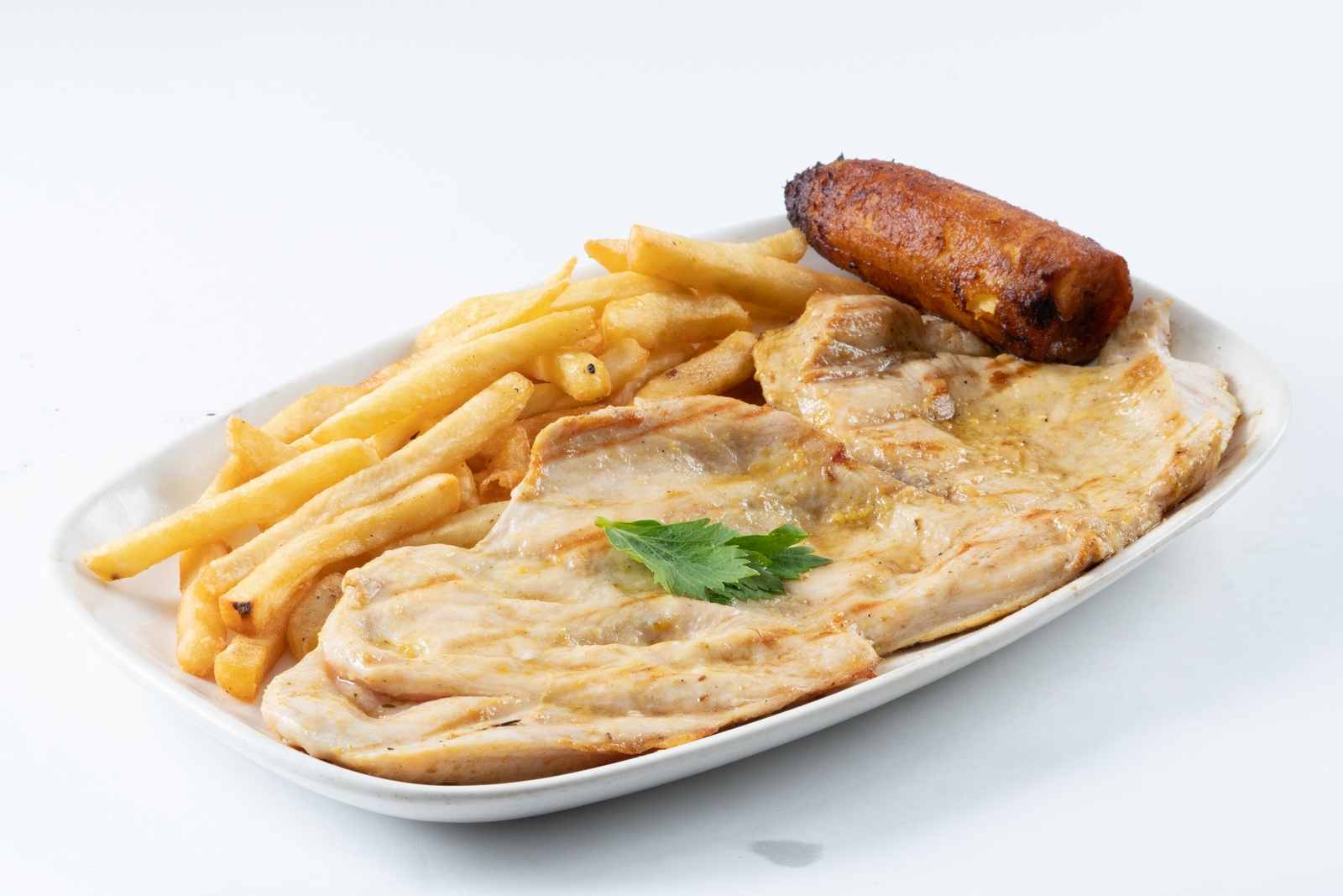 200 gr de pechuga deshuesada, papitas fritas, ensalda, madurito
