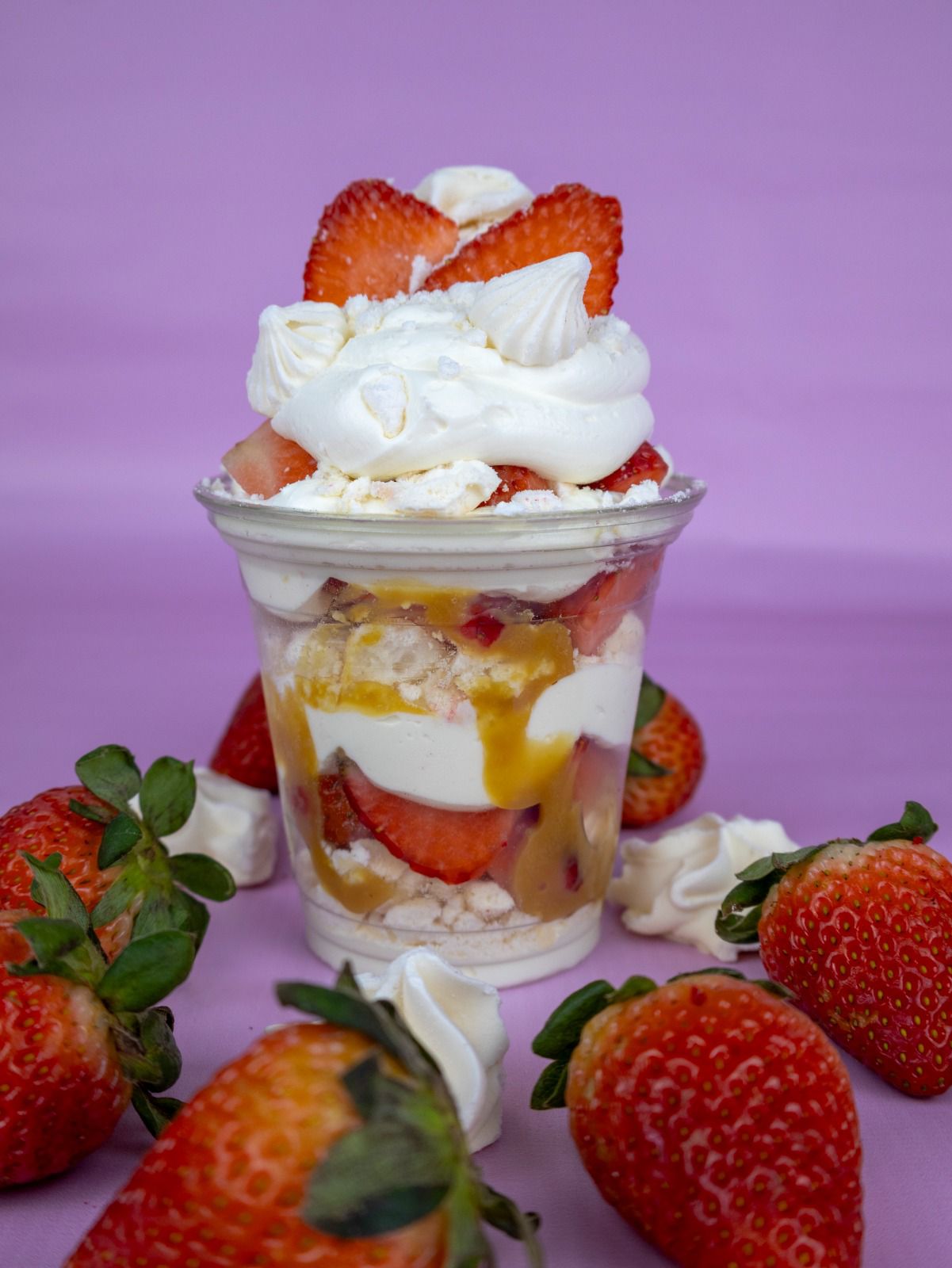 Fresas con crema de la casa, salsa de arequipe, acompañados por capas de merengues crujientes.