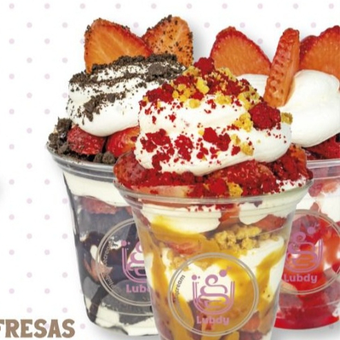 Fresas con crema de la casa, trozos de red velvet y salsa de fresas natural.