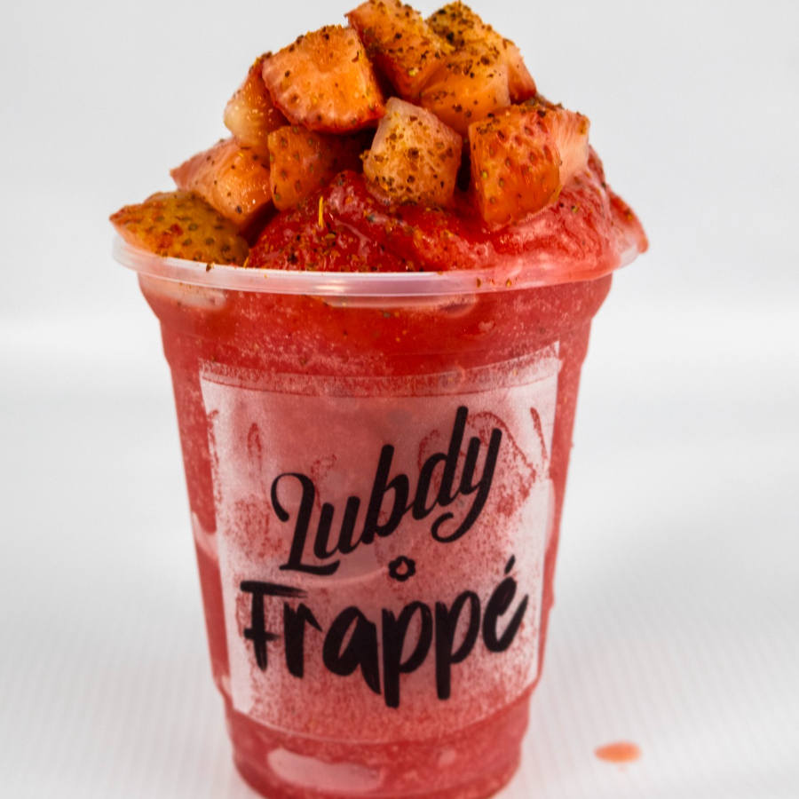 Granizado de fresa con topping de fresa, limon, pimienta sal y tajin.