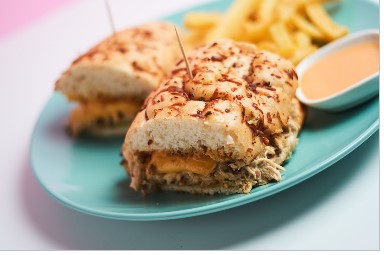 Pan baguette de finas hierbas con pollo en salsa carbonara, queso mozzarella, queso sabanero y acompañado de papas a la francesa.