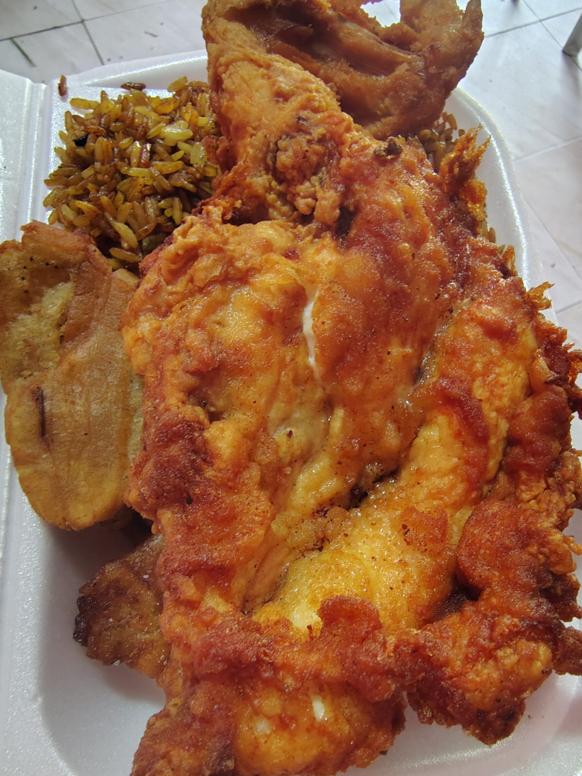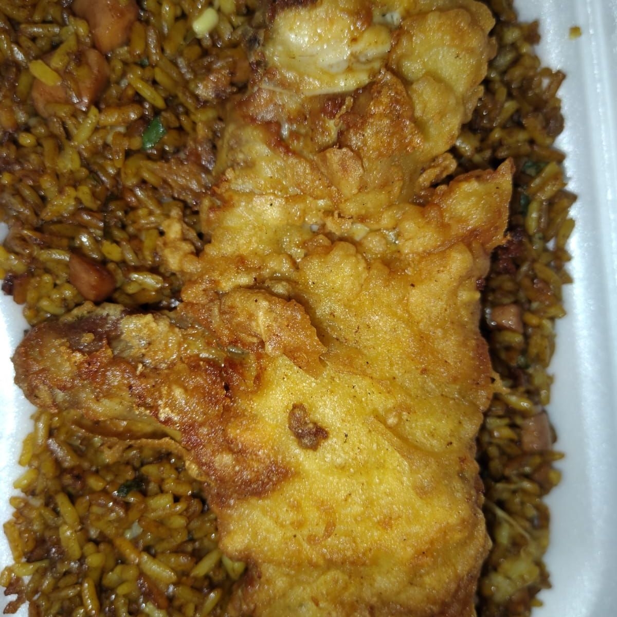 Crujiente pollo a la broster acompañado de arroz chino y patacones o papas a la francesa