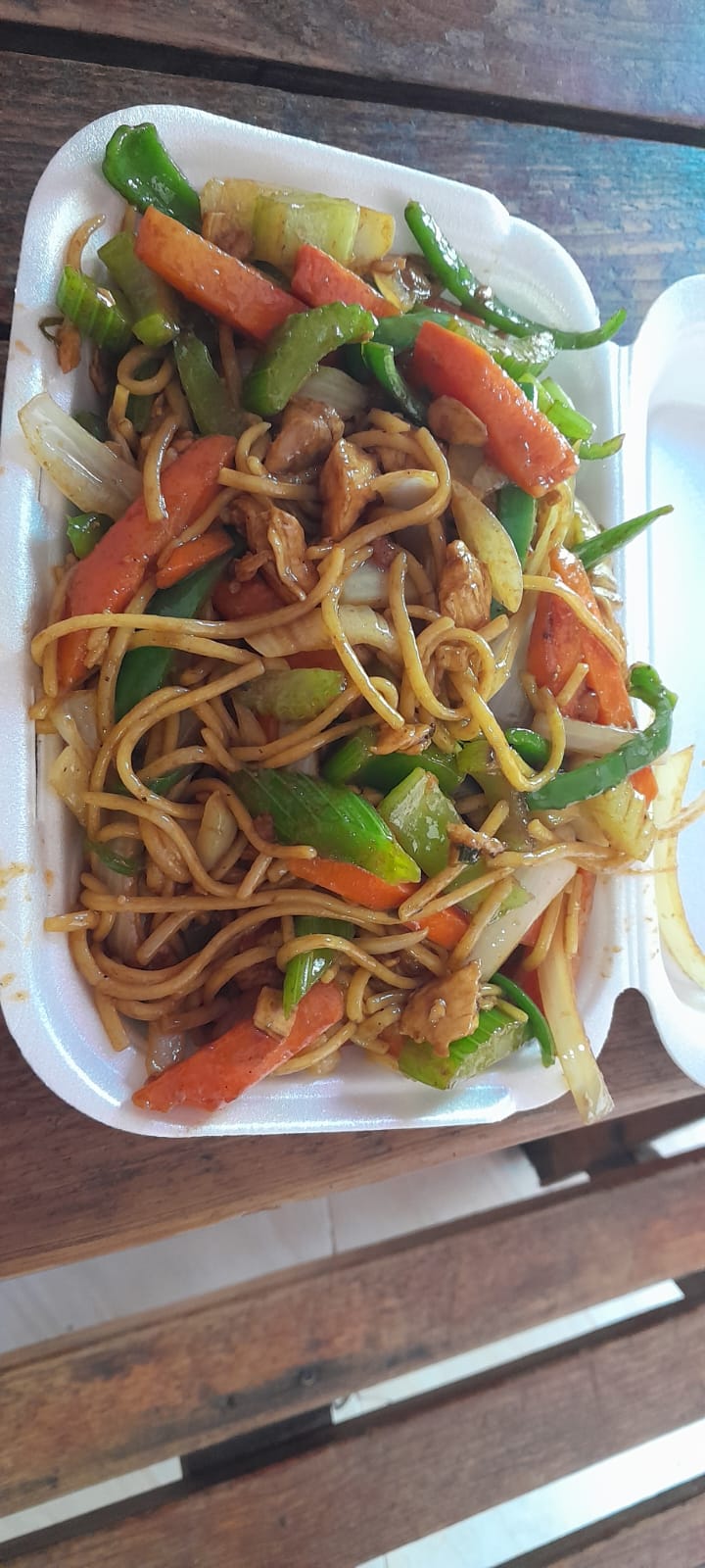 Medio de Shop Mein, pimentón, zanahoria, cebolla blanca y apio( cerdo pechuga y camarón)