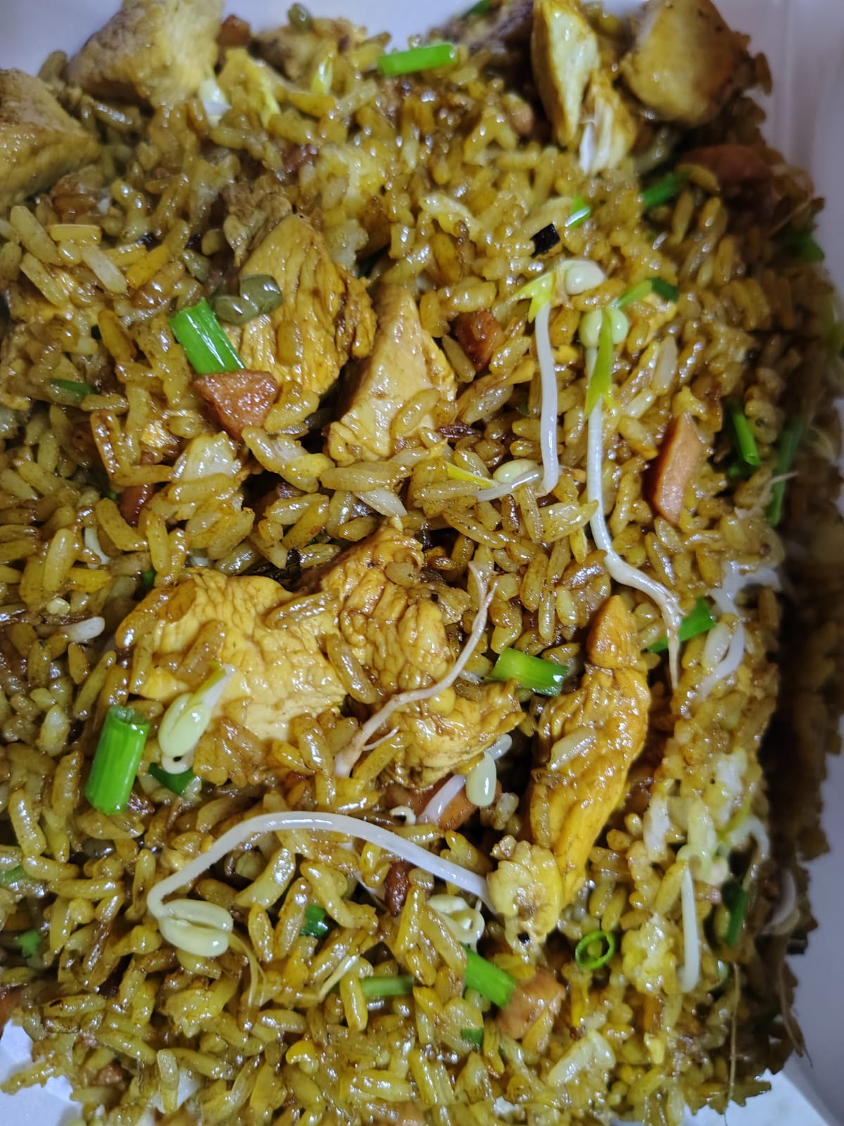 Entero arroz de pollo con trozos de pechuga, arroz chino, cebollita, jamón, raíz china