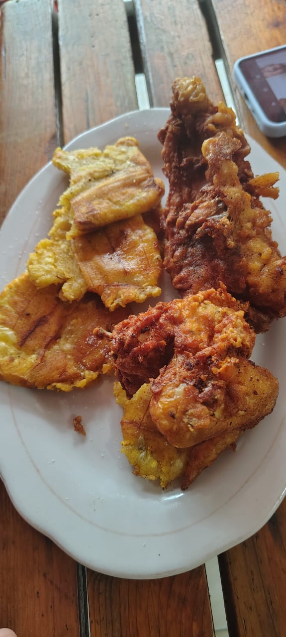 Porción de pollo jugoso acompañado de papas fritas o patacones a elección.