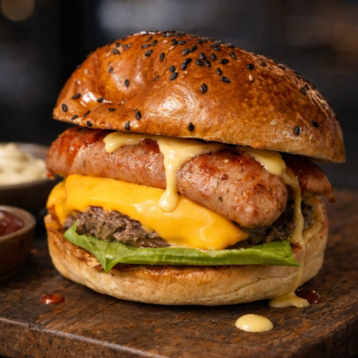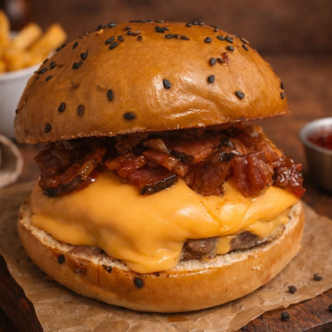 Pan brioche artesanal, carne premium 150g, tocineta, doble queso cheddar fundido y salsa BBQ ahumada - Papas francesas (Potente y adictiva.)