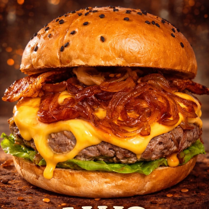 Pan brioche, carne premium 150g, tocineta, cebolla caramelizada, lechuga romana, queso cheddar y salsa gourmet de la casa. Papas francesas.