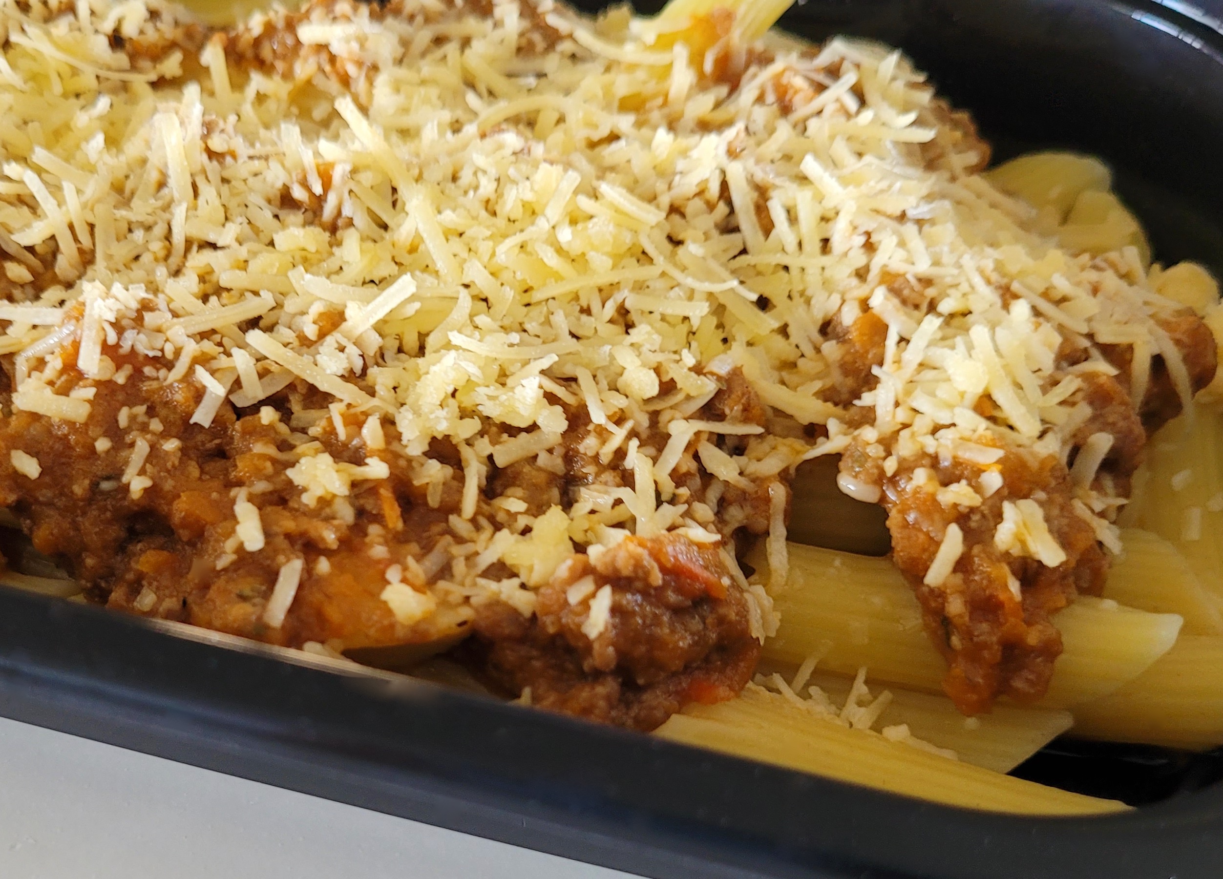 Penne con salsa bolognesa a base de tomates y carne de res.