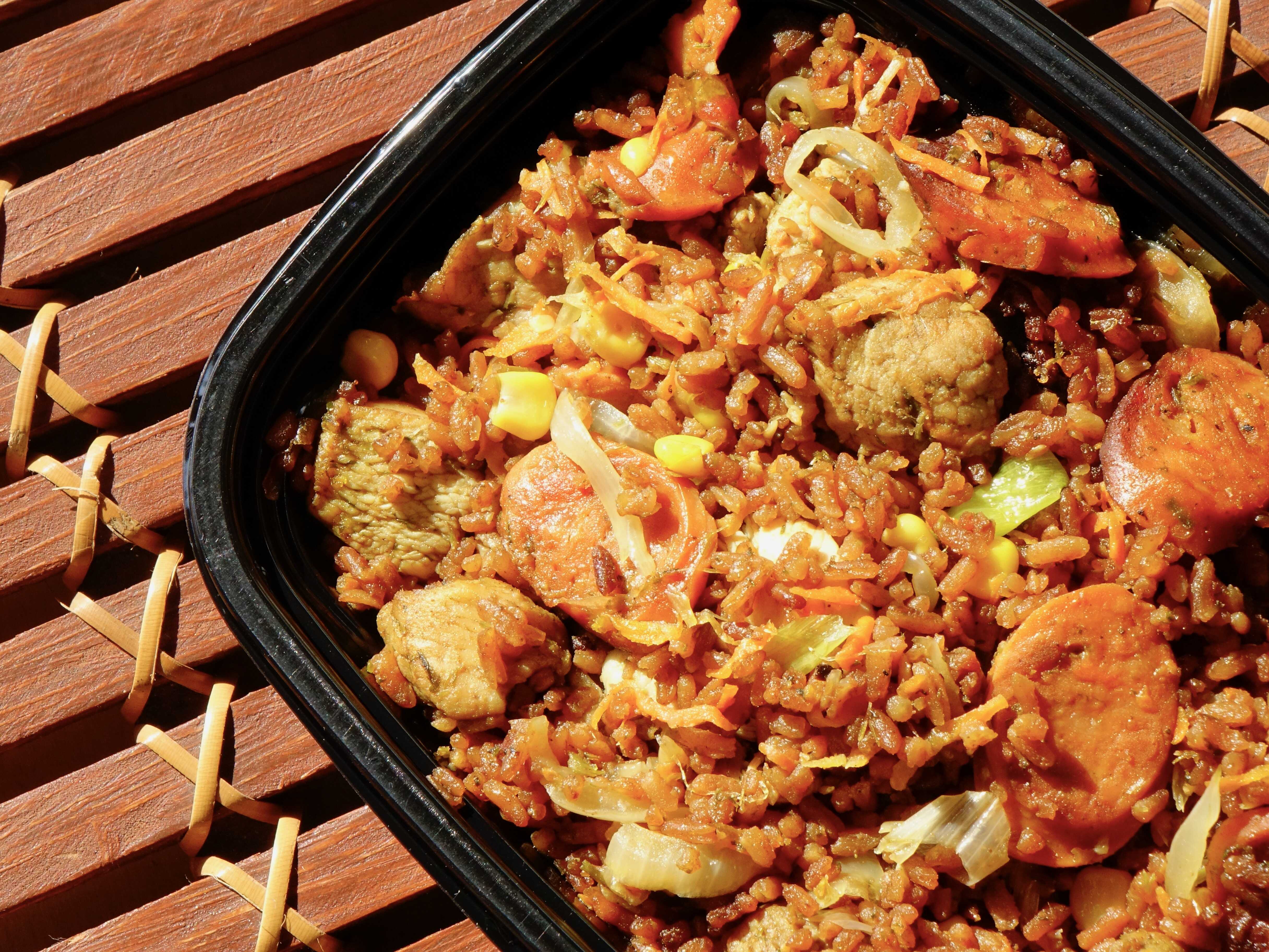 Arroz con coco, cerdo agridulce, pollo, chorizo y vegetales salteados.