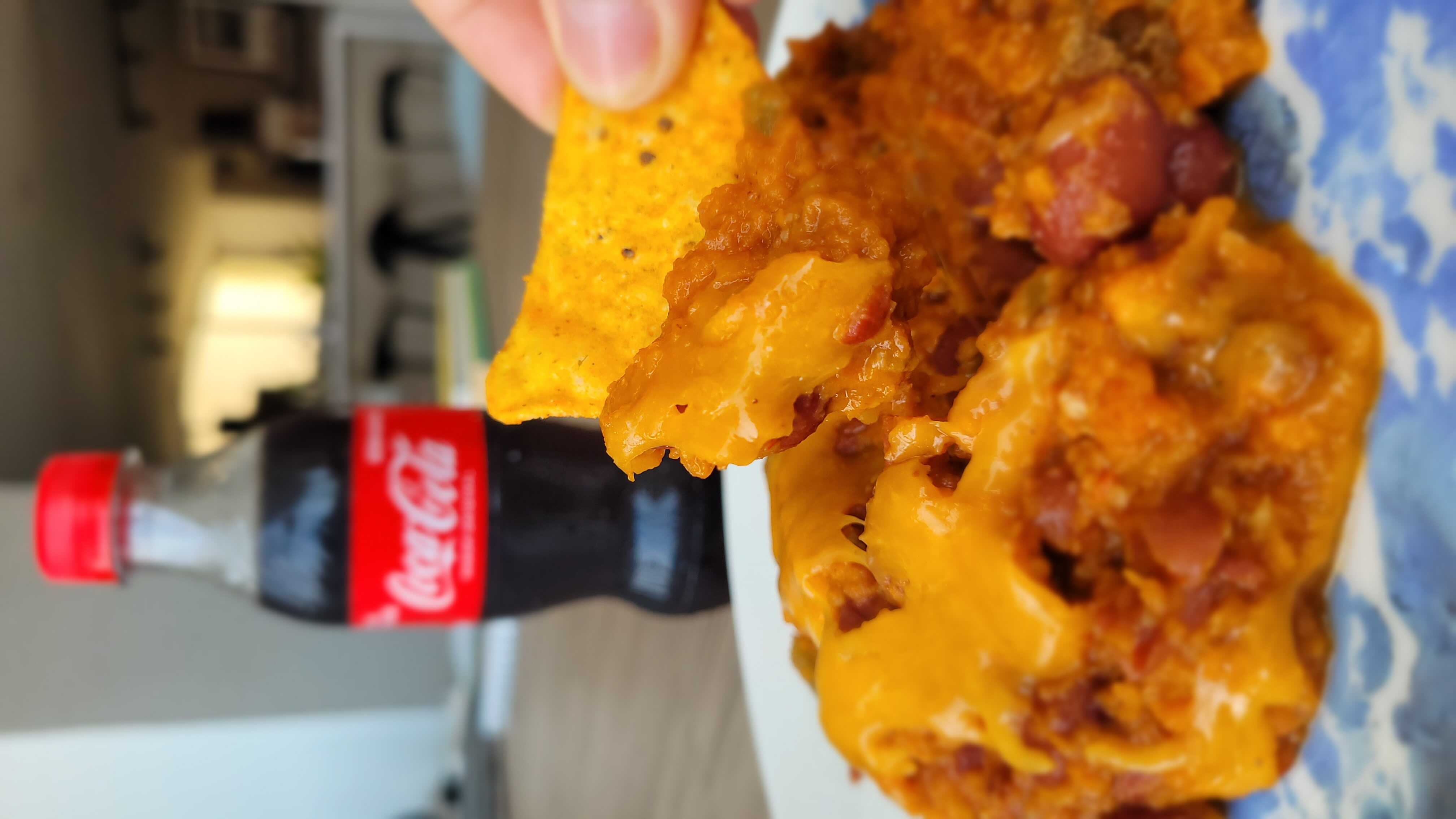 Chili hecho a base de tomates frescos, chiles naturales, carne molida, con un nivel de picante suave, con Doritos y Coca Cola 400 ml.