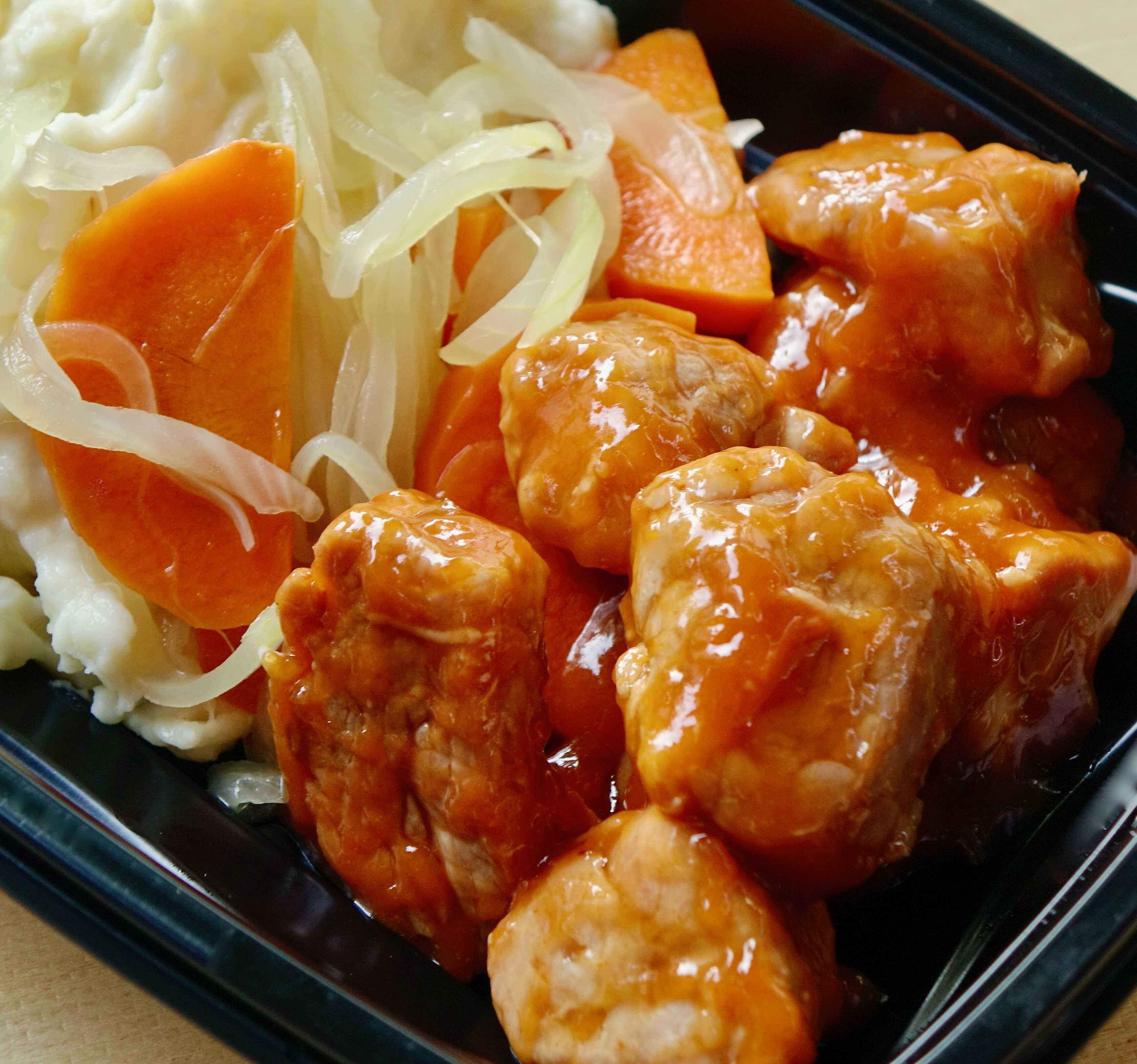 Lomo fino de cerdo con una deliciosa salsa agridulce, acompañado de zanahoria y cebolla salteadas y un suave puré de papas adobado con orégano.