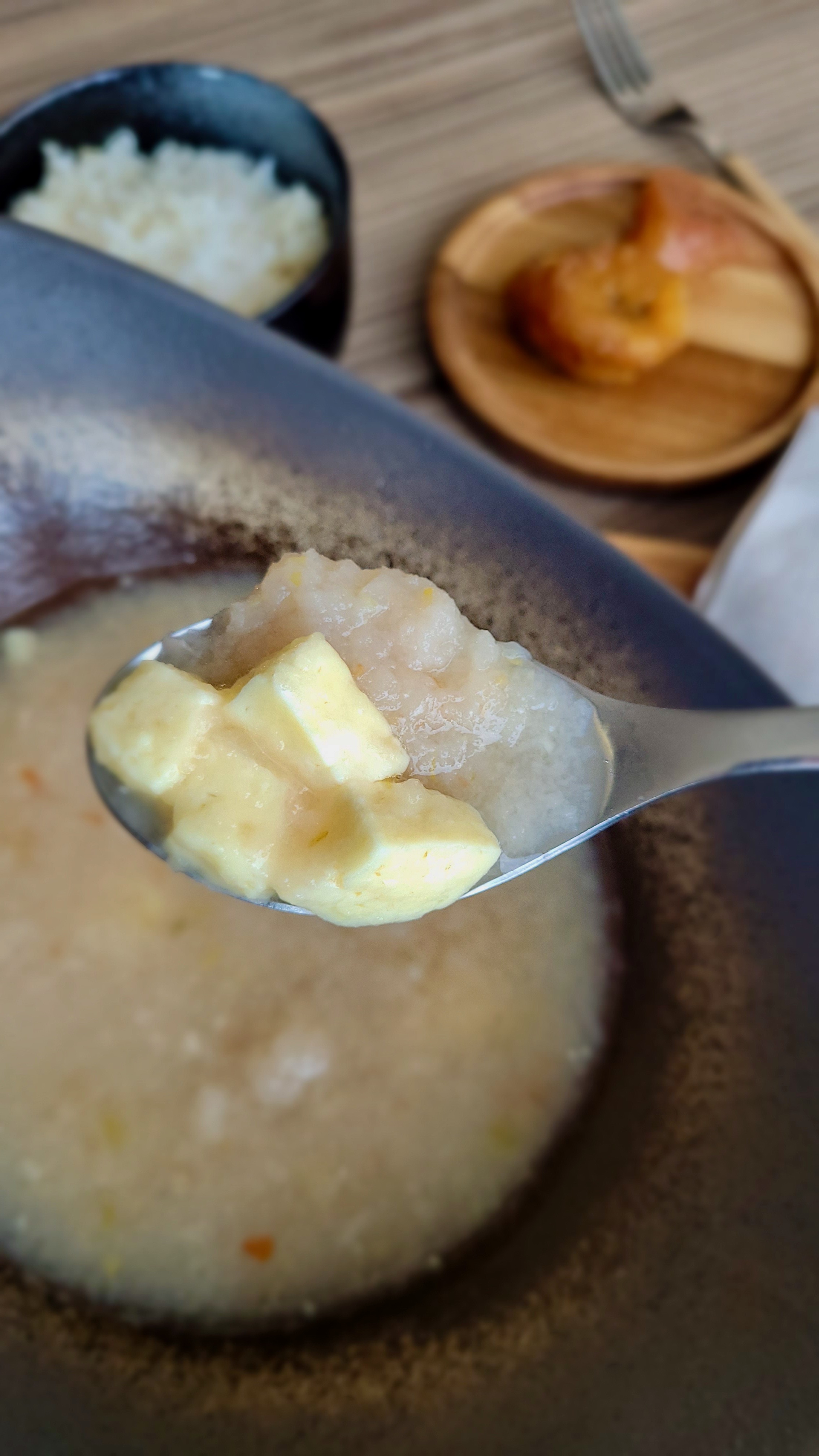 Sopa adobada con hogao, queso costeño y ñame blando. Acompañado de arroz y platáno pícaro