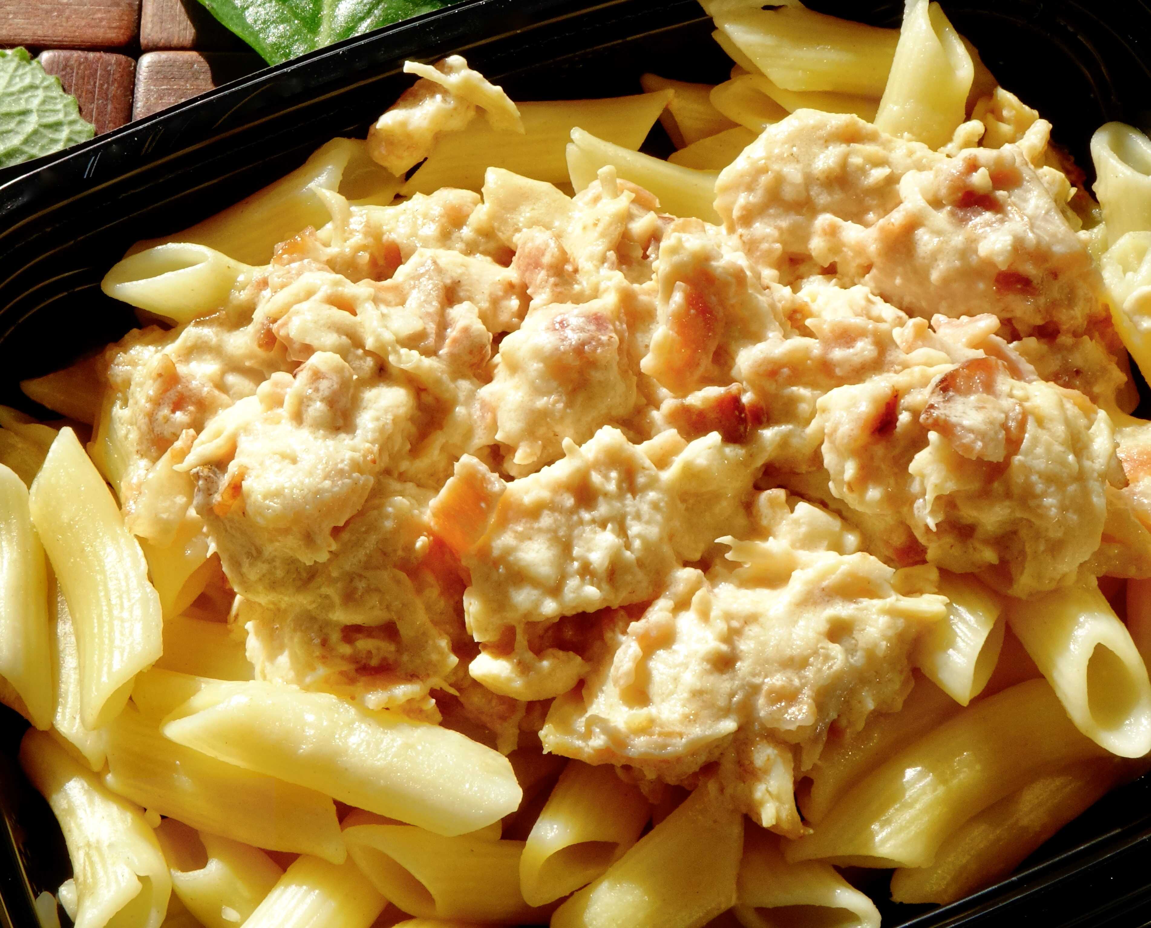 Penne con una cremosa salsa que combina quesos, tocineta y pechuga de pollo.