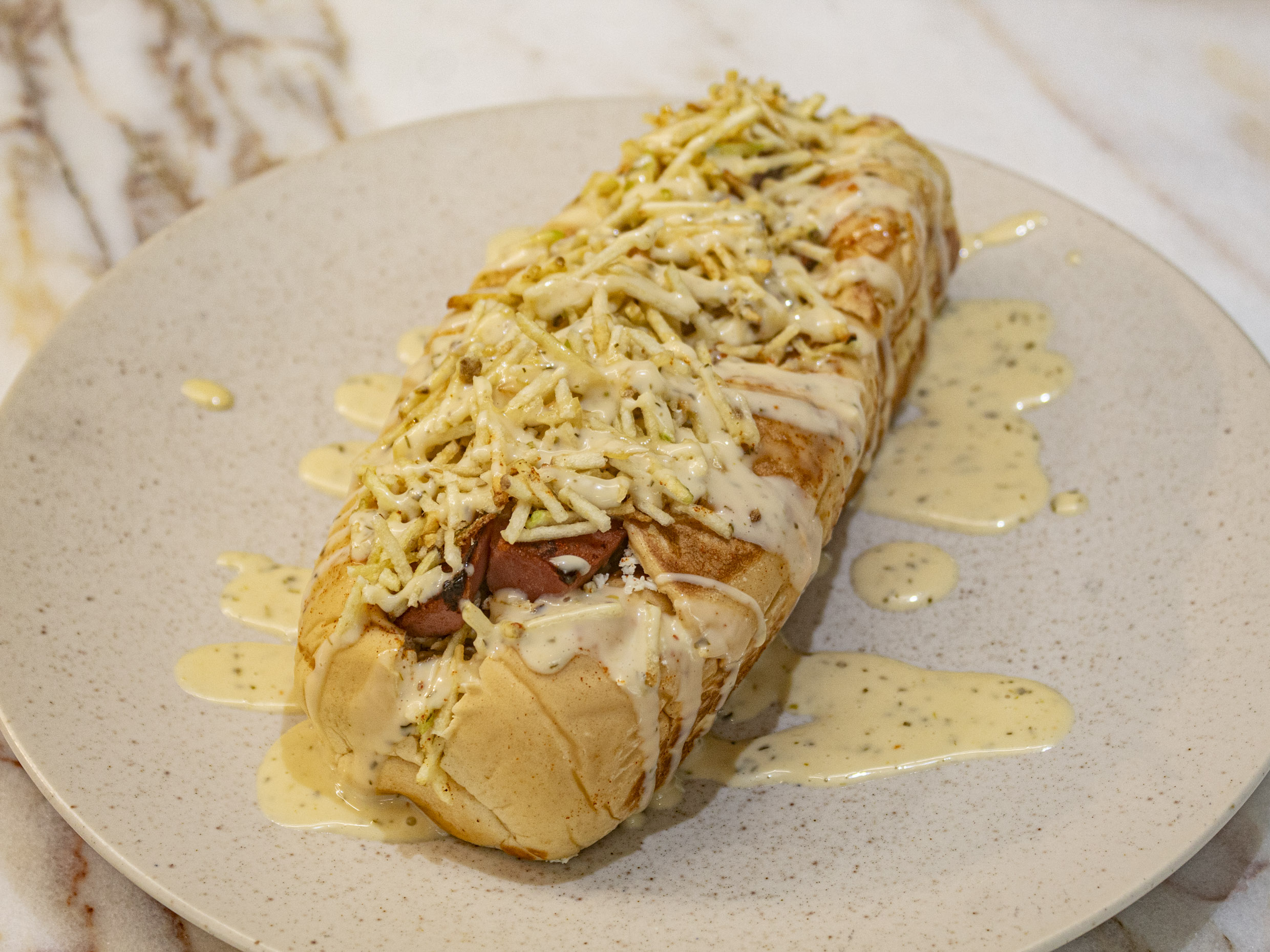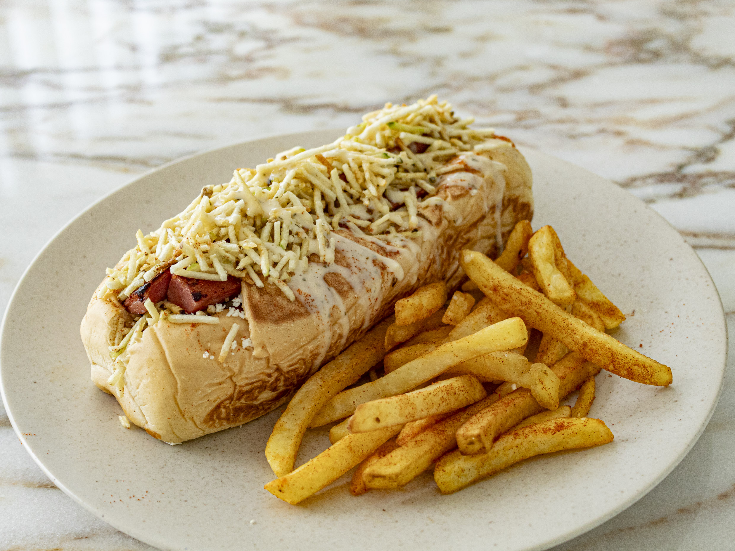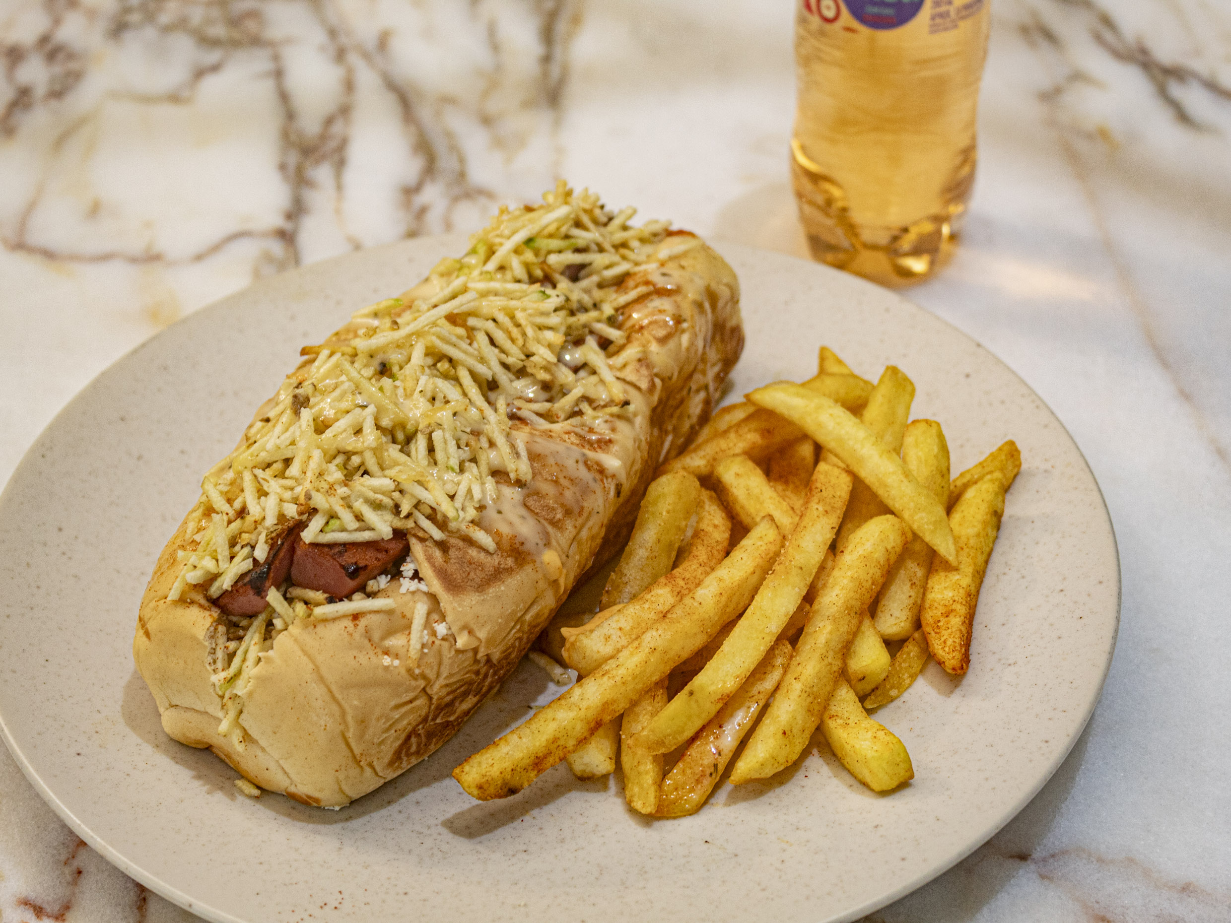 Perro caliente con salchicha de cerdo, queso rallado, papas ripio, cebolla, salsas