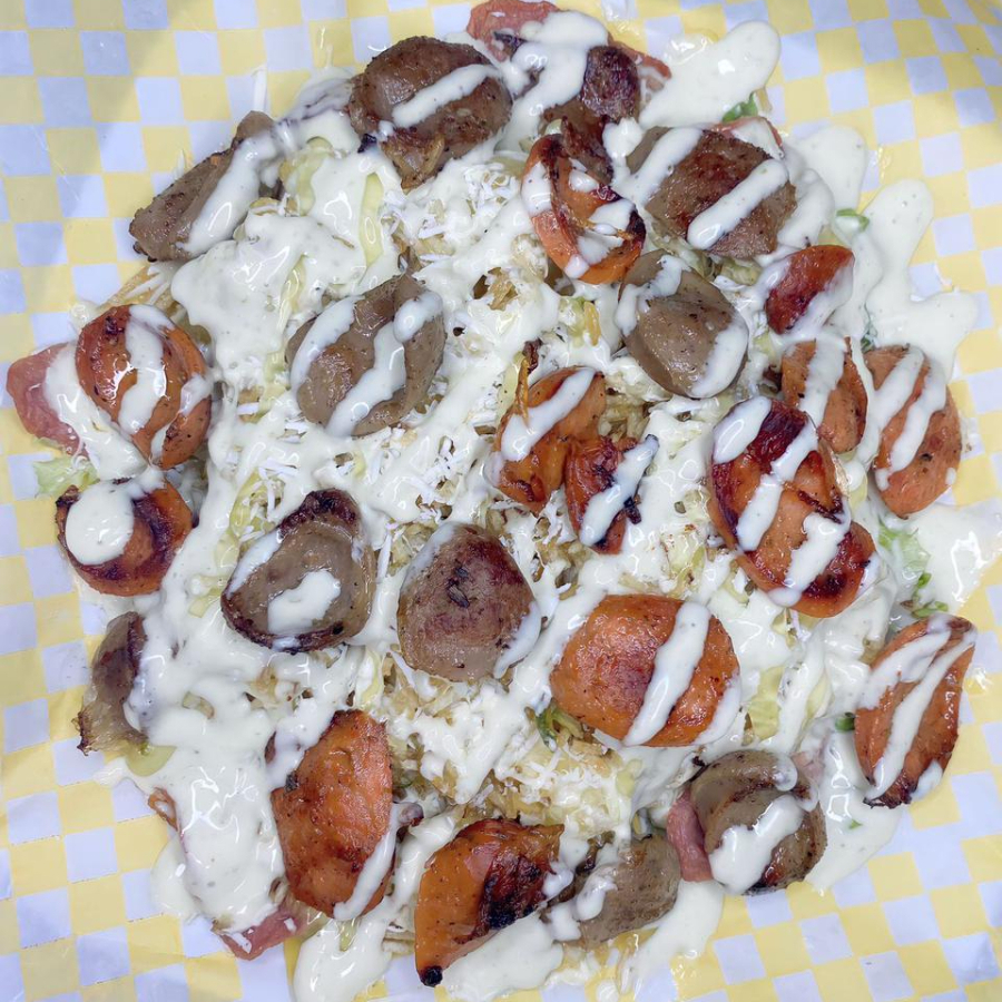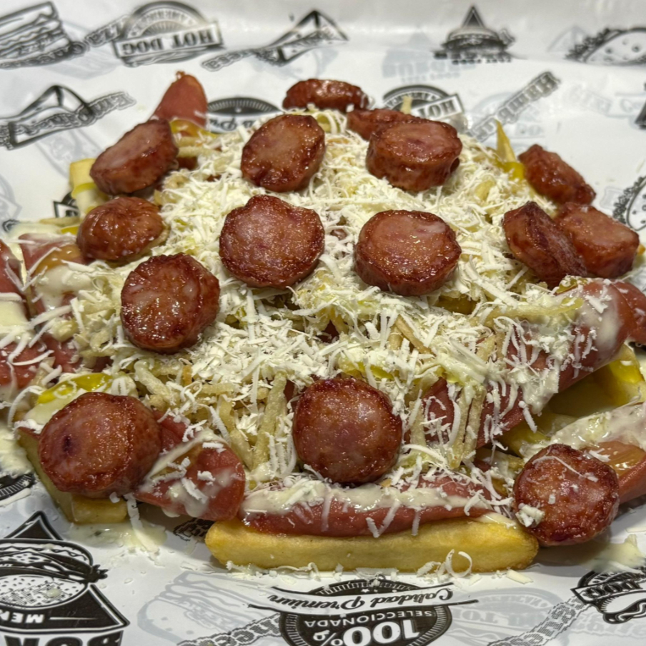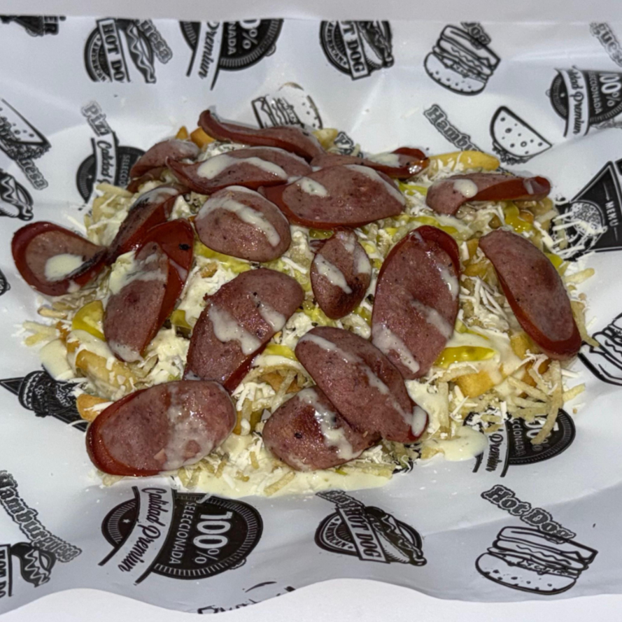 220 g De papa francesa, chorizo y salchicha clásica, queso costeño, papa chongo y salsa tártara.