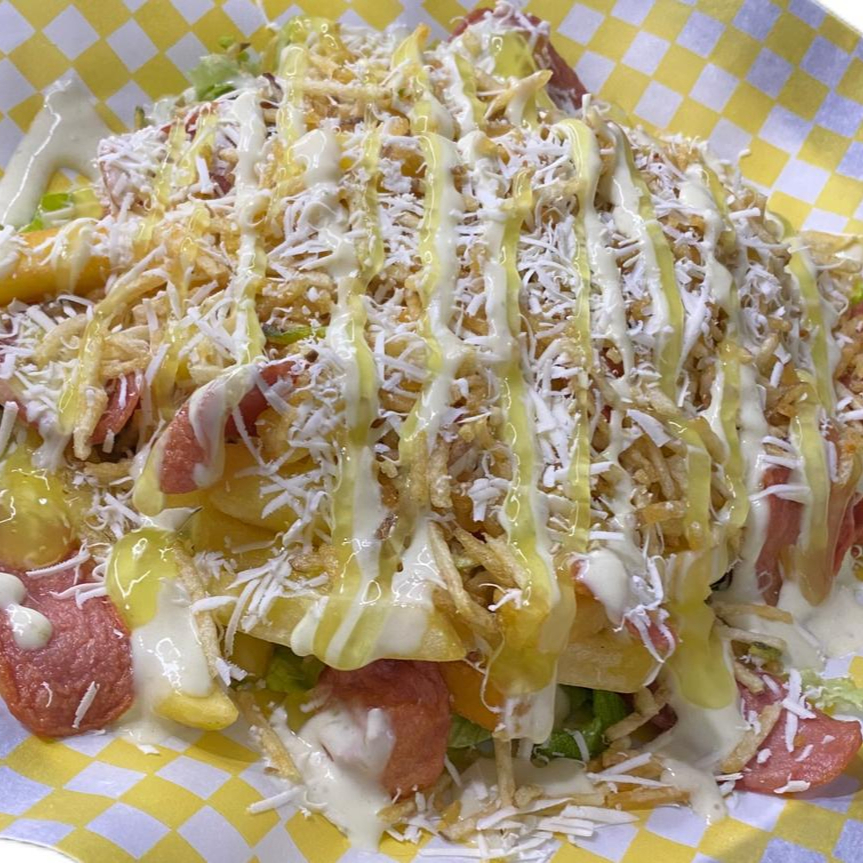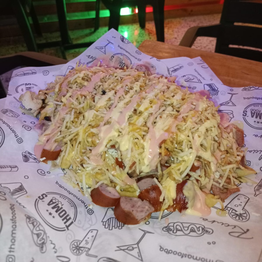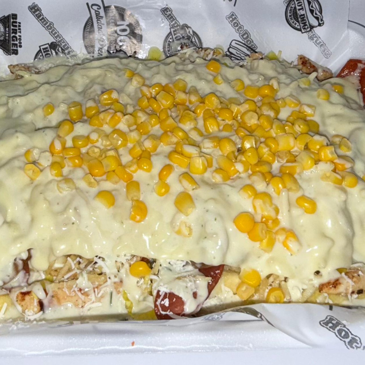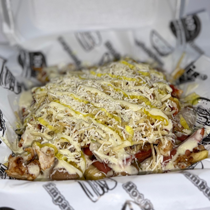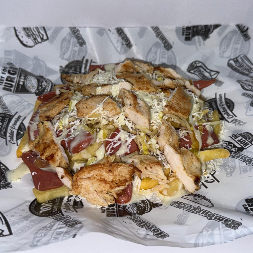 220 g De papa francesa, 100 g de pollo desmenuzado y salchicha, queso costeño, papa chongo y salsa tártara.