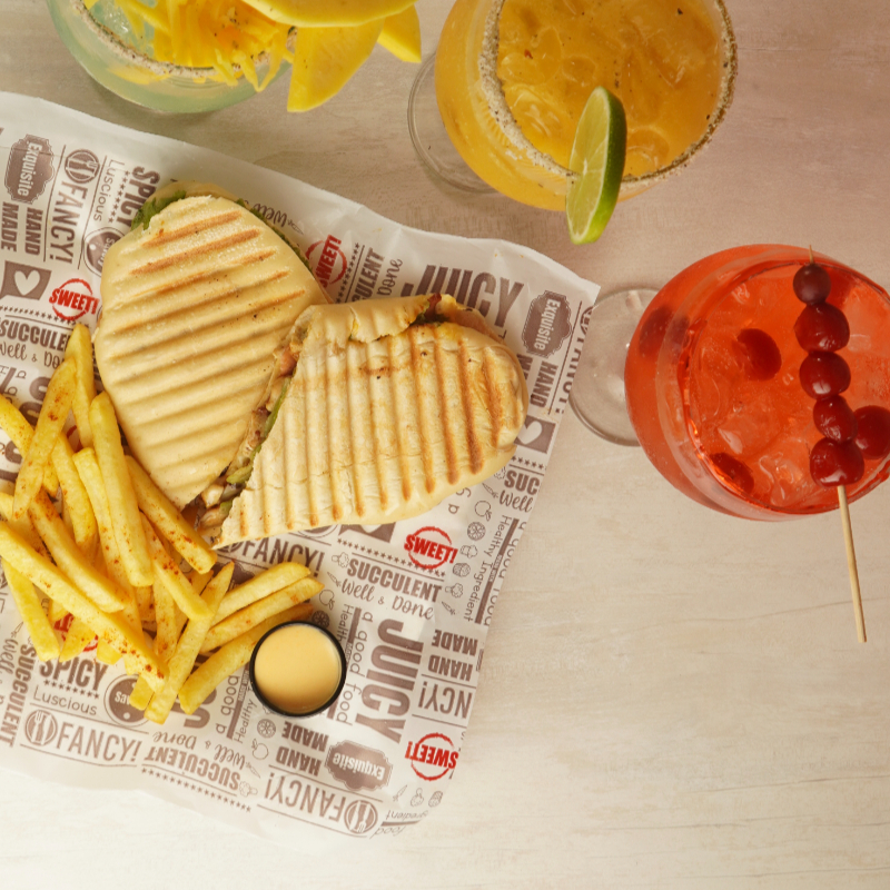 Pan francés, 140 g de pechuga de pollo, mozzarella y verduras.