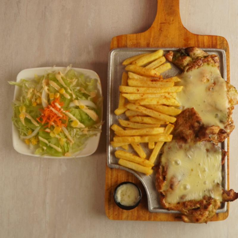 350 g De pechuga de pollo con queso mozzarella acompañado de papas a la francesa.
